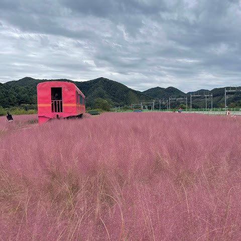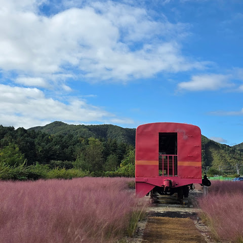 저희처럼 강촌역 근처 종착역으로 가서 다시 예약해야 하는 경우가 아니라, 김유정역 근처 출발 지점으로 가는 게 맞는지 꼭 확인하세요. 다행히 몇 시간 후에 예약할 수 있었어요. 마을 밖 카페에서 커피와 점심을 먹고 핑크뮬리를 구경하며 시간을 보낼 수 있었는데, 정말 좋았어요.