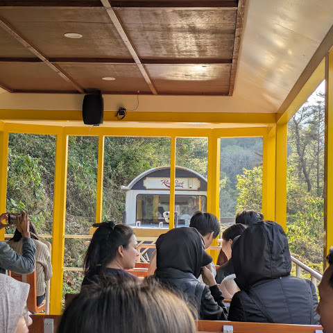 레일카는 가속도가 붙으면 관성으로 움직이기 때문에 페달을 계속 밟을 필요가 없습니다. 저는 2인승 레일카에 탑승했는데 괜찮았습니다. 약간 오르막길이 있어서 다리가 아팠지만, 2명이면 더 쉬웠을 것 같아요.