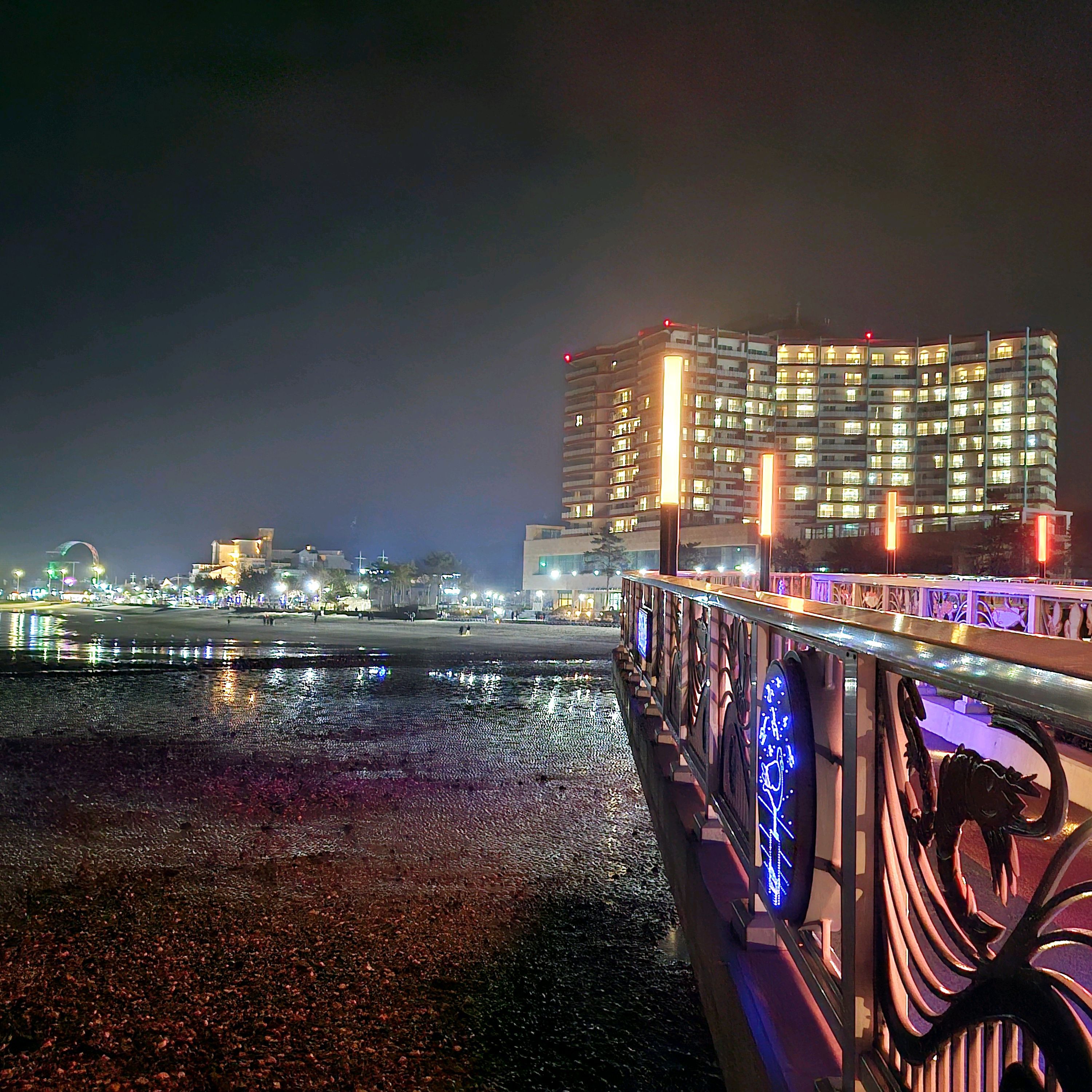 저녁 먹고 산책겸 들린 길이 1.5km의 아름다운 해수욕장! 사실 커피 생각이 간절해서 차돌려 찾아왔는데 카페는 벌써 불들이 꺼져있고 횟집과 조개구이집은 불야성이네요. 이왕 온김에 무창포타워나 구경할까 했더니 여기도 닫혀있어 해변따라 산책했어요. 와~여기도 신비의 바닷길이 열리는 곳이 있네요. 한참 걷다보니 무창포 낙조 5경중 한 곳인 닭벼슬섬으로 이어지는 다리가 보여 조명따라 아무 생각없이 가다가 뭔가 시커먼 장막같은게 나와 엄청 놀랐네요. 닭벼슬섬이었는데 조명 시설을 안해놔서 너무 깜깜해 잘 안보였어요. 멀리 리조트의 화려한 불빛들과 여기저기서 쏘아 올리는 불꽃들, 다리를 수놓는 조형까지 멋진 산책길이었어요.