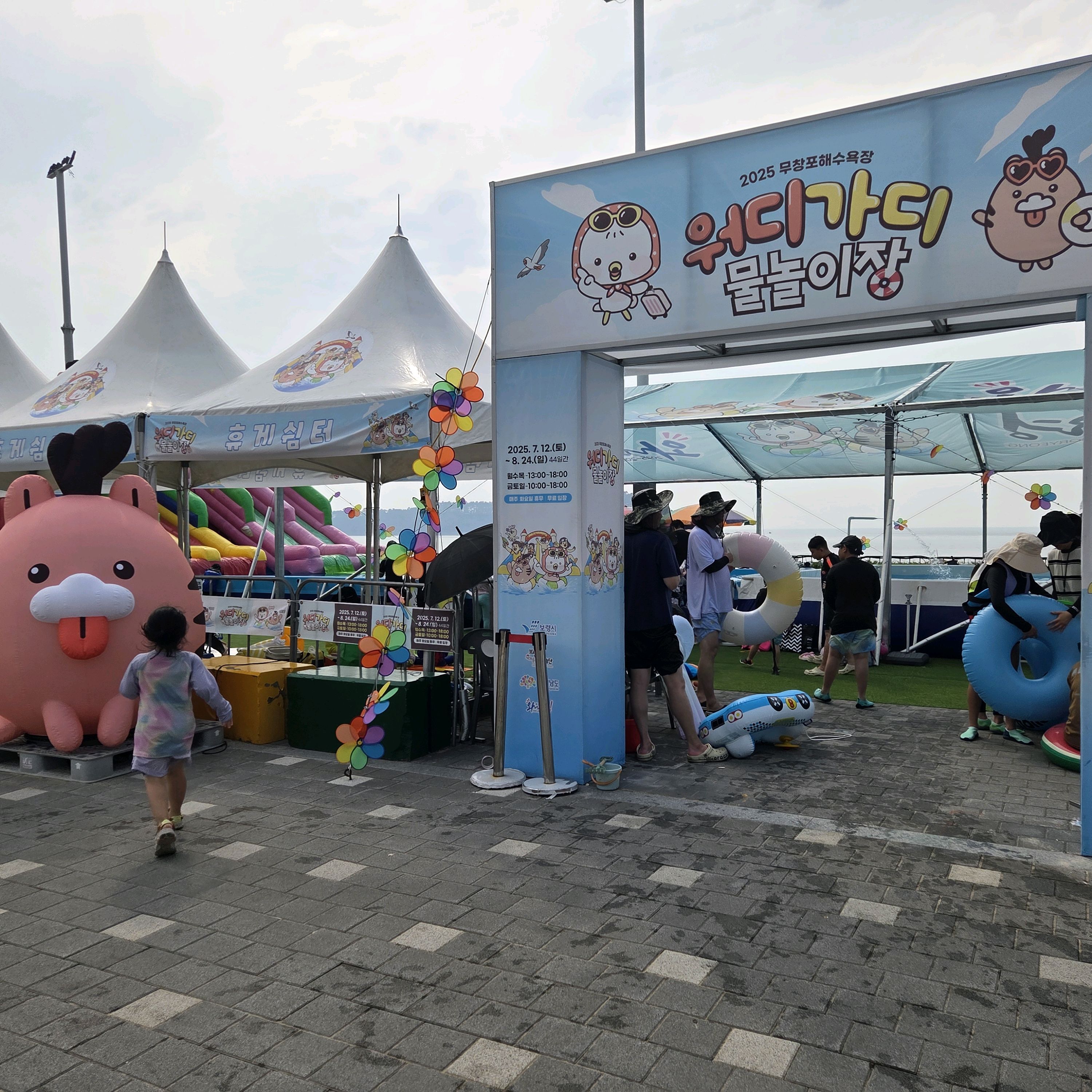 이번에 무창포해수욕장 근처에 무료 물놀이장이 새로 오픈했다고 해서 가족과 함께 다녀왔어요. 오픈하고 한 시간 정도 지나서 입장했더니, 이미 물놀이장 안쪽은 자리가 다 차 있더라고요. 그래서 조금 아쉽게도 밖에 자리를 잡았는데, 다행히 직원분들이 추가로 천막을 쳐주셨어요. 다만 이 과정에서 조금 안 좋은 일이 있어서 아이들이 안좋은 모습을 보았는데, 그래도 금방 잊고 즐겁게 놀았답니다.
