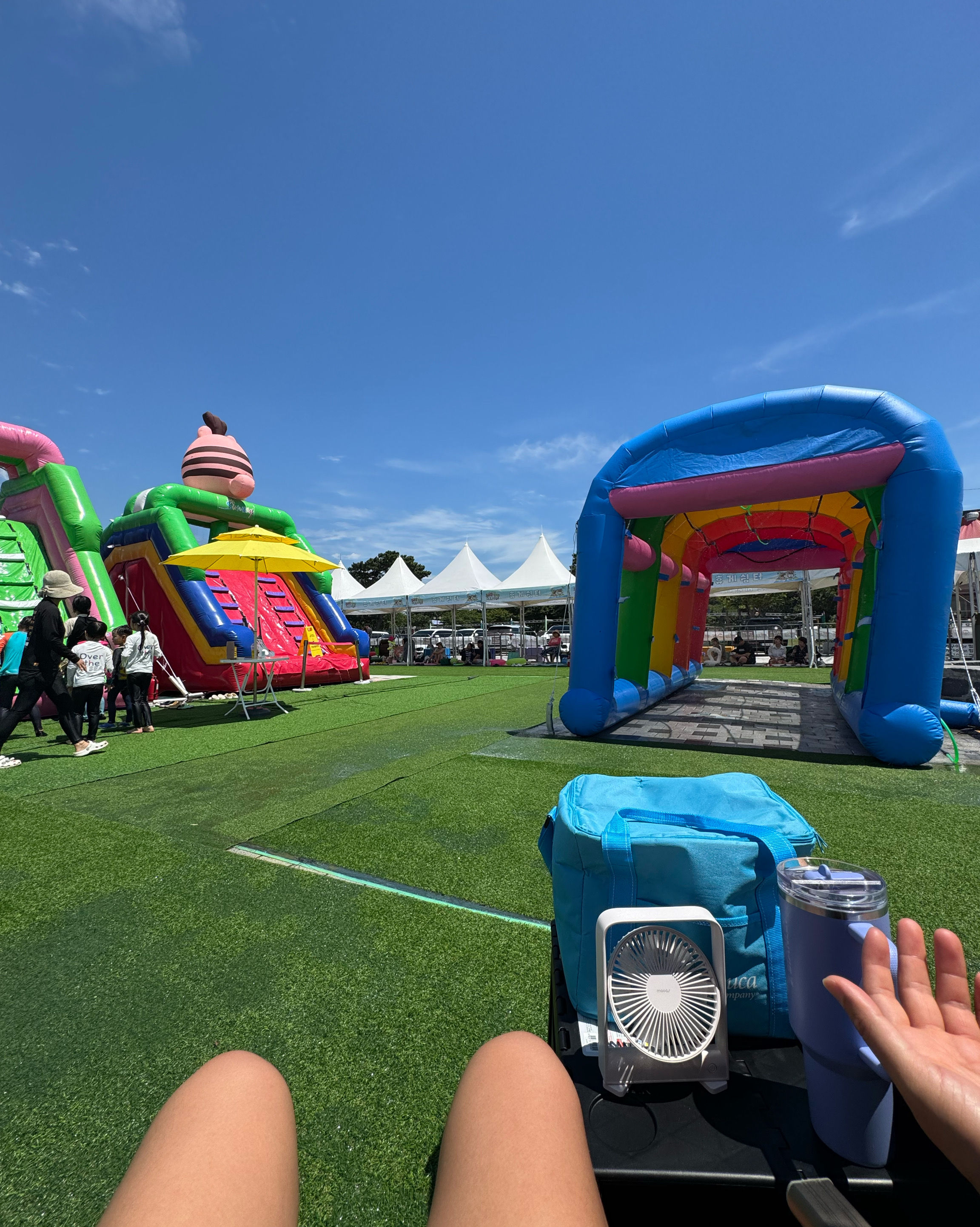 물놀이장 자체는 정말 괜찮았어요. 구명조끼나 의자 같은 것도 한정적으로 대여가 가능하고, 에어 미끄럼틀과 분수 시설이 잘 되어 있어서 아이들이 신나게 놀기에 딱이었어요. 물총을 가져가면 훨씬 더 재밌게 놀 수 있고, 수영모자는 필수라 꼭 챙겨가시는 걸 추천드려요.