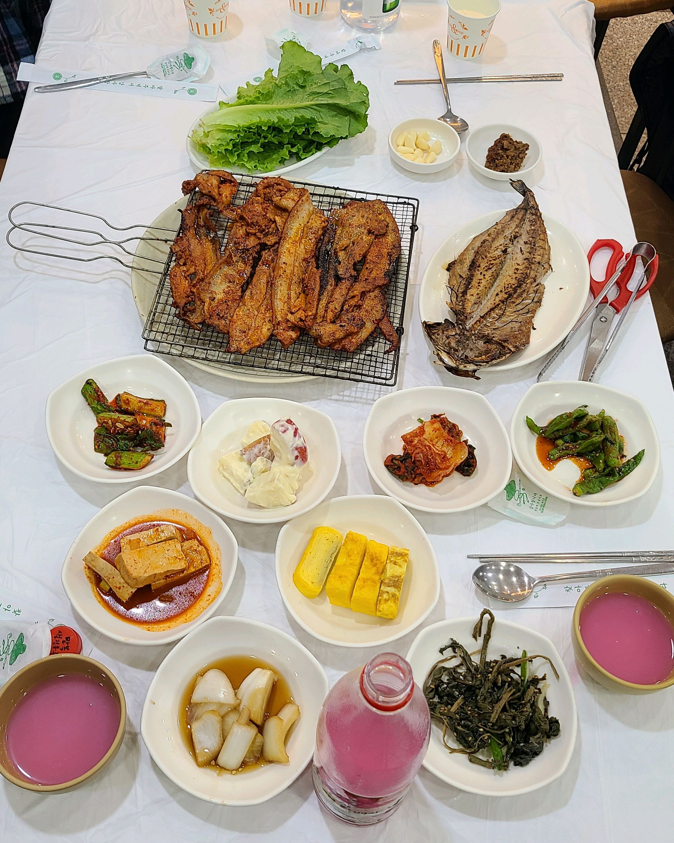 밑반찬이 보기와 달리 맛이 없어요...두부조림은 감칠맛 없이 고추가루, 두부 맛 밖에 안나고, 계란말이는 보기엔 모형 같은데, 간을 안해서 퍽퍽하고 싱거워요... 주부라 조금만 신경쓰면 맛 낼 수 있는거 아는데 아쉬워요... 예전에는 고등어구이 맛있었는데 이번에 한 입 먹어보니 삼치 맛이 나네요... 자반 고등어 왕소금 뿌려 구으면 맛이 없을 수 없는데, 생선에 간도 잘 안했고, 자반 자체가 맛 없는 고등어네요...이른 마감하는 시간에 방문해서 그런지 처음에 시킨 고기는 많이 타서 나왔고, 두번째 시킨 고기는 덜 익은 느낌이었어요. 다음에는 다른 집 가려고요