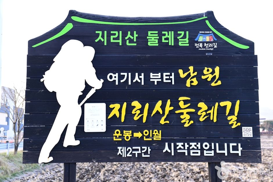 그중 운봉-인월 구간은 전라북도 남원시 운봉읍 동천리와 남원시 인월면 인월리를 잇는 9.9km의 지리산길이다. 이 구간은 오른쪽으로 바래봉, 고리봉을 잇는 지리산 서북 능선을 조망하고 왼쪽으로는 고남산, 수정봉으로 이어지는 백두대간을 바라보며 운봉고원을 걷는 길로 옛 통영별로 길과 제방길로 구성된다. 걷기 난이도가 하인 이 구간은 4시간 코스로 제방길과 임도로 되어 있어 길 폭이 충분히 넓어 여럿이 함께 걷기에 좋은 평지길이고 황산대첩비, 국악의 성지, 송흥록생가 등 문화적이고 역사적인 요소들을 골고루 즐기면서 걷기에 좋은 곳이다. 동절기 정비 기간에는 이용이 통제될 수 있으며 인월에는 지리산 둘레길 인월센터가 있다. |