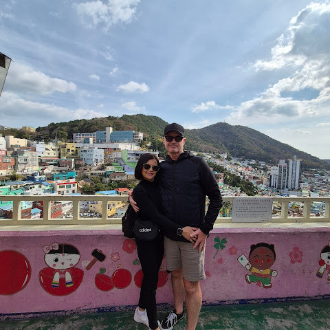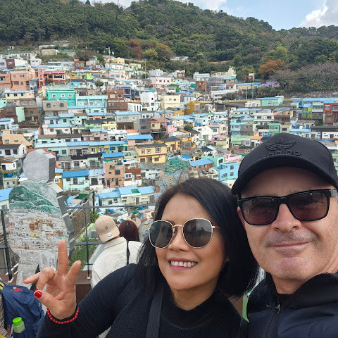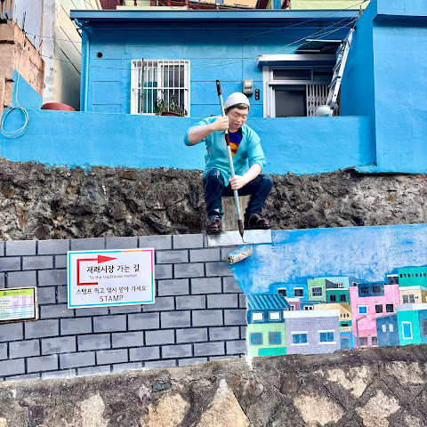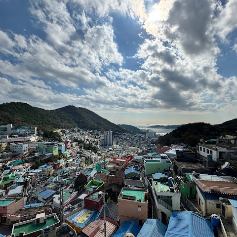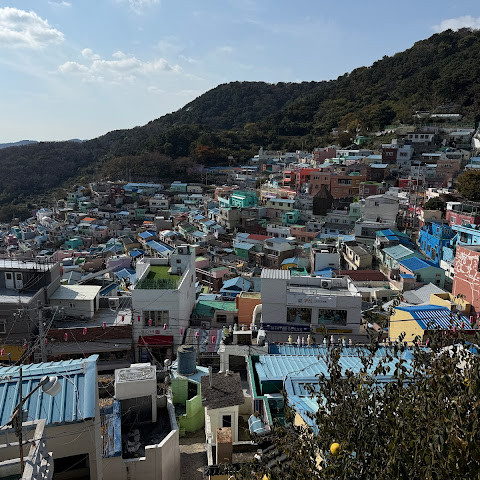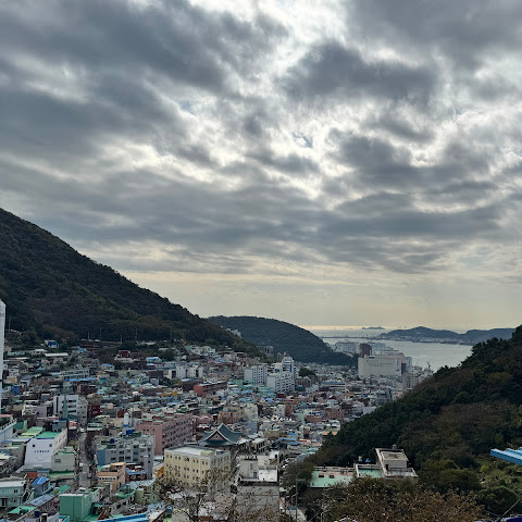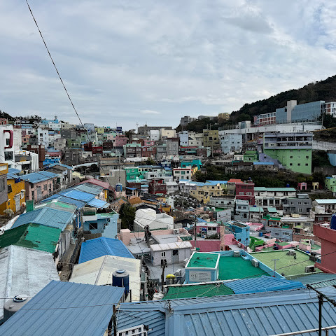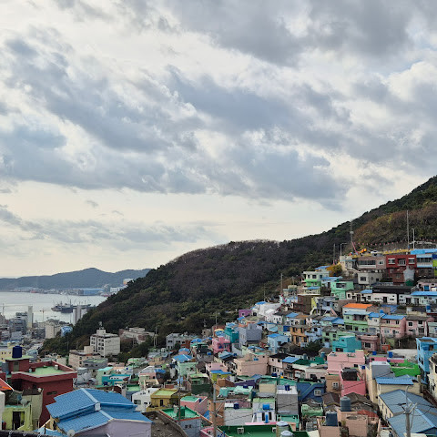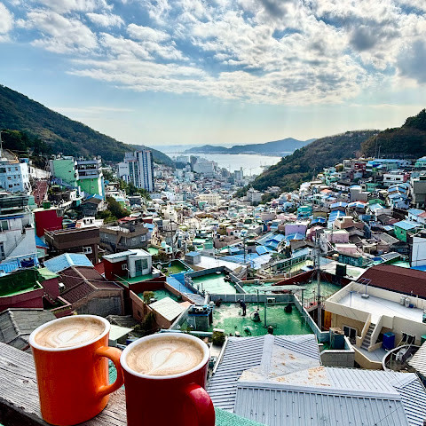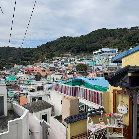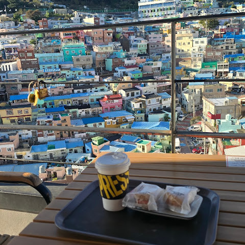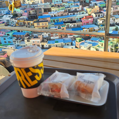 정말 멋진 경험이었어요! 오르락내리락할 각오를 하세요. 부산 시내에서 버스를 타고 이 알록달록한 마을로 바로 가는 버스로 갈아탔어요. 2월에는 날씨가 꽤 추워서, 그곳의 멋진 커피숍에서 커피를 마셨어요.