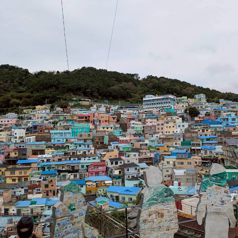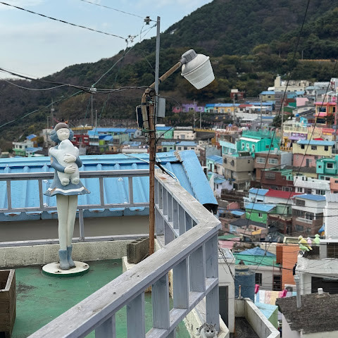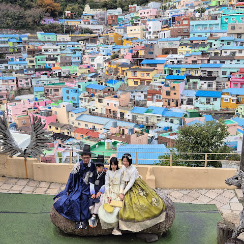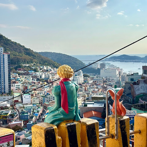 감천동 문화마을은 날씨가 좋지 않고 안개가 짙으면 "어린 왕자와 달"과 "어린 왕자와 여우" 뒤편의 알록달록한 오두막들이 보이지 않습니다. 한복을 대여해 주고(패스카드 사용 가능), 어린 왕자와 여우와 함께 사진을 찍으려는 사람들이 (어떤 사람들은 한복을 입고) 줄을 서 있어 긴 줄이 생기기도 합니다.