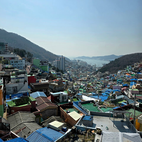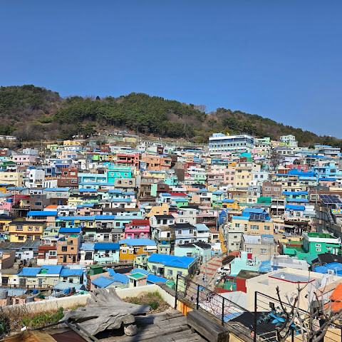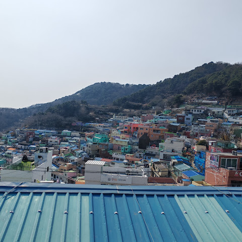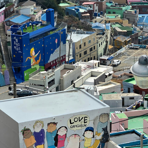 사람들은 감천문화마을을 언덕을 따라 늘어선 알록달록한 집들 때문에 "한국의 산토리니"라고 부르곤 하는데, 그 말이 딱 맞습니다. 아기자기하고 사진 찍기 좋은 곳이지만, 관광객이 정말 많아요. 비수기에 갔는데도 생각보다 사람이 많았습니다.