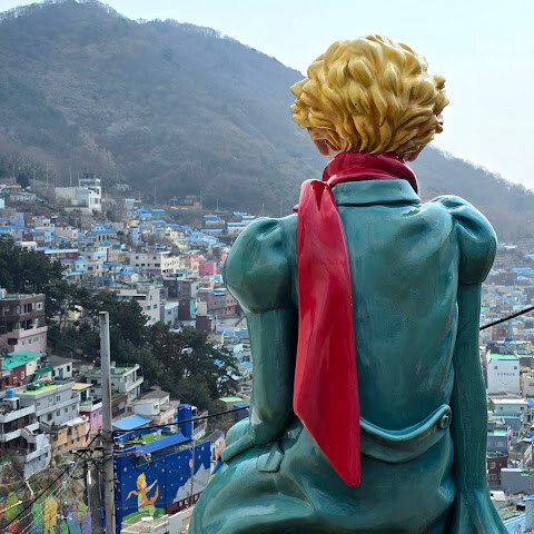 카페와 기념품 가게가 가득한 메인 거리도 몇 군데 있습니다. '어린 왕자'를 주제로 한 벽화와 조형물도 많이 보이는데, 저희는 그 의미를 완전히 이해하지는 못했지만 감천문화마을에서는 아주 중요한 테마인 것 같고, 모두들 그 앞에서 사진을 찍더라고요. 관광객이 많은 곳을 벗어나면 실제로 사람들이 살고 있는 집들도 많고, 조용히 예의를 지켜달라는 안내문도 곳곳에 있어서 좋았습니다.