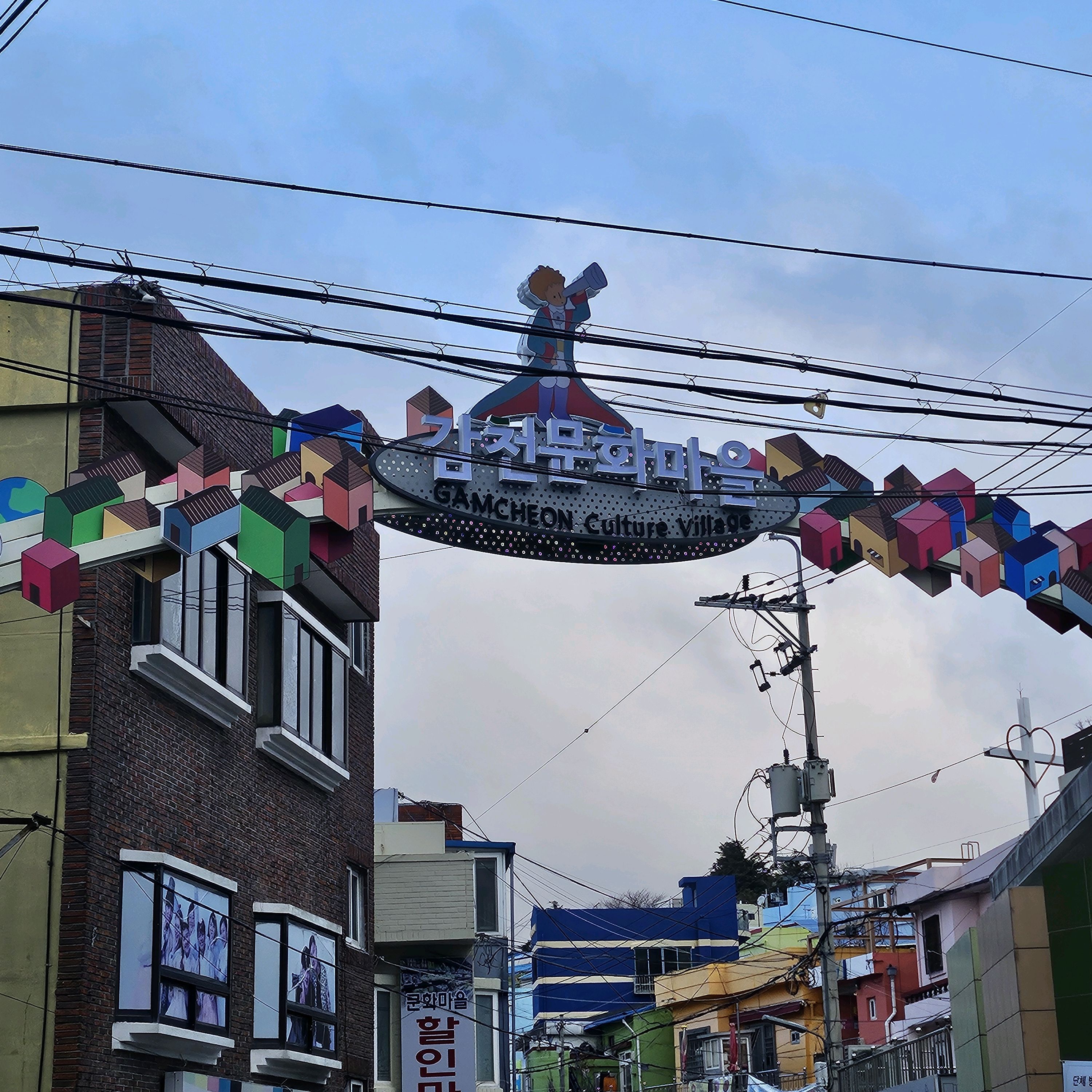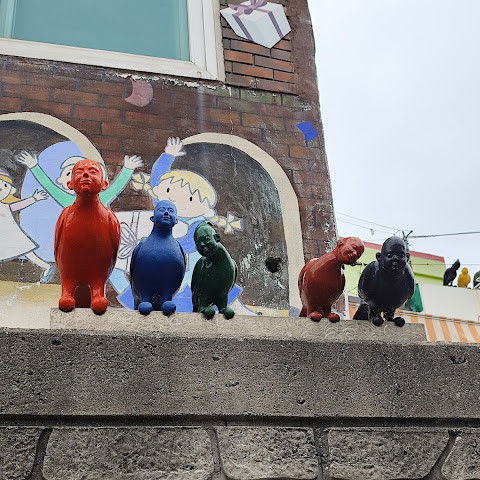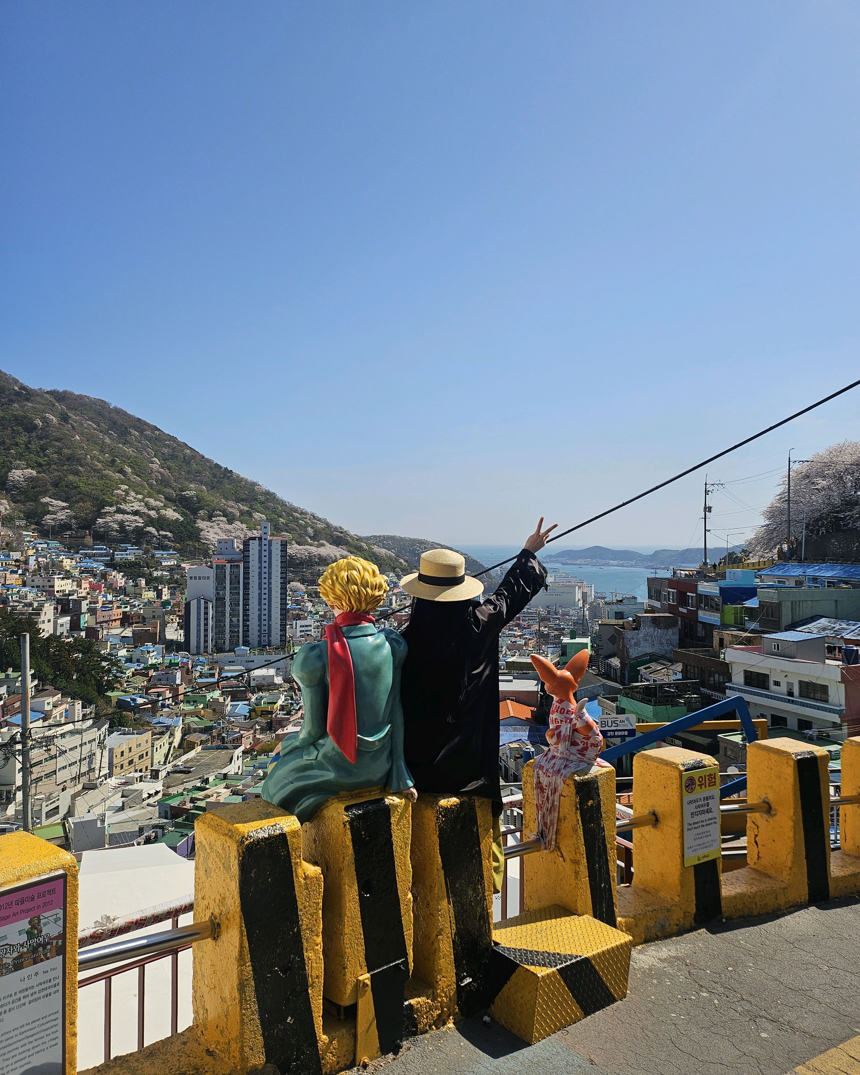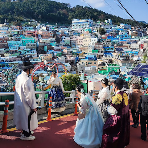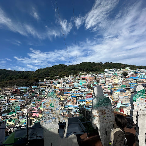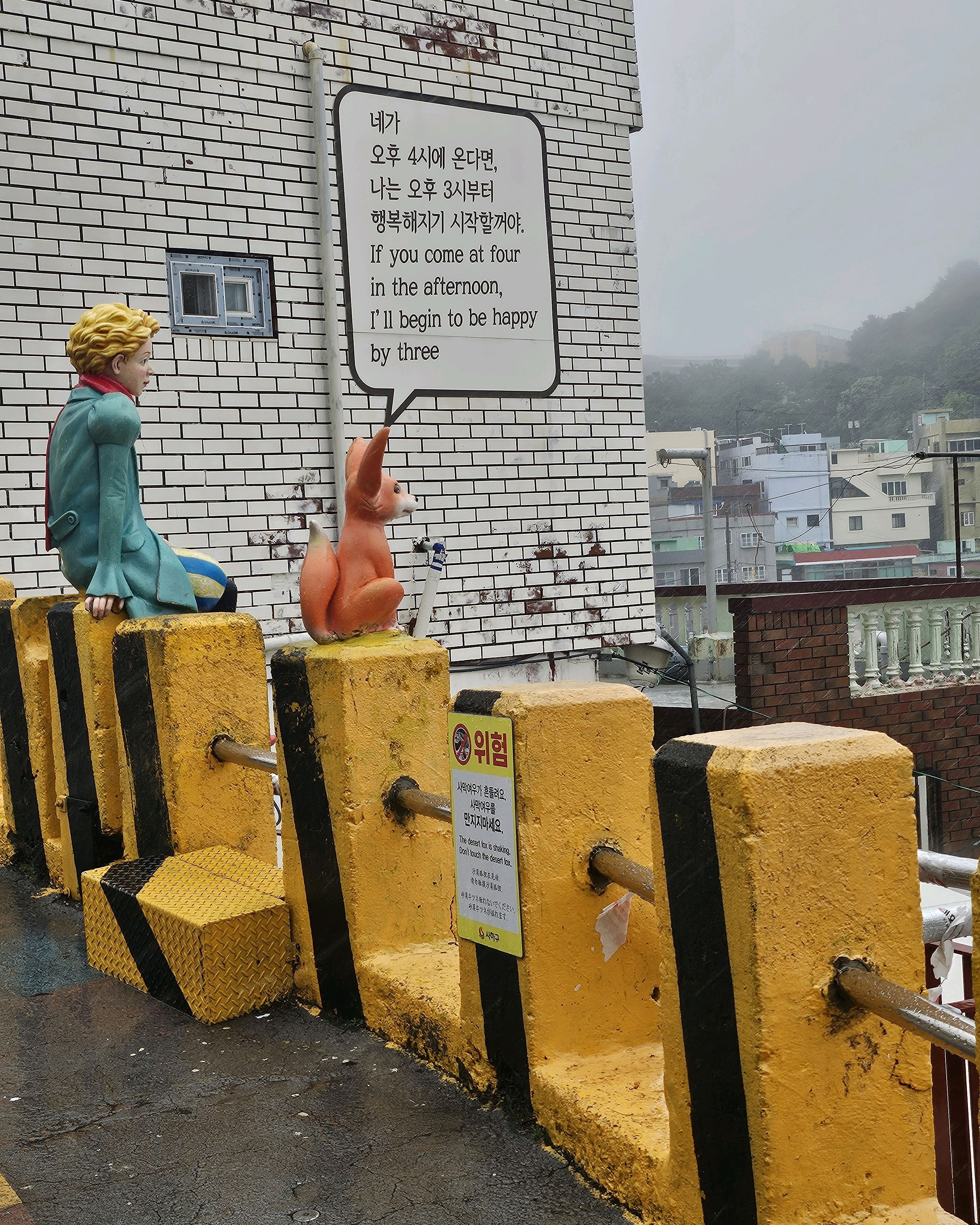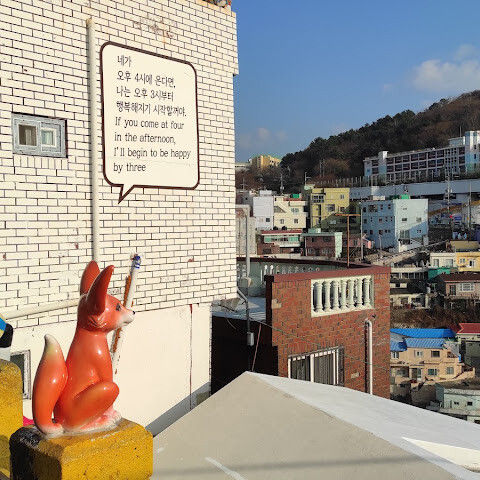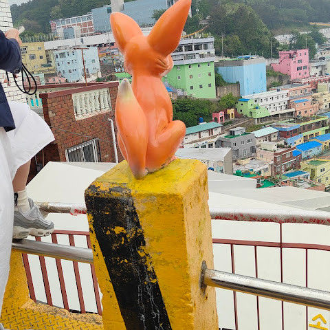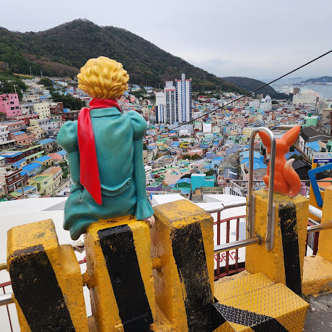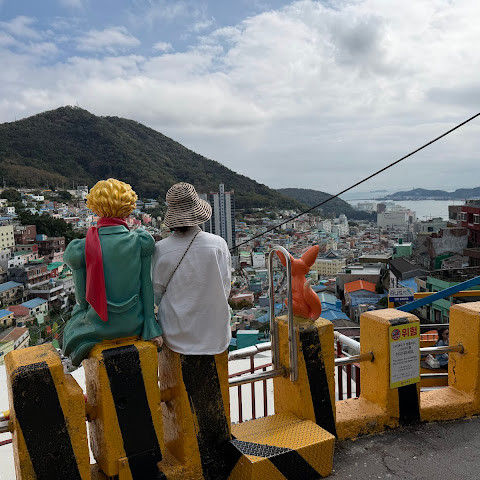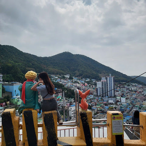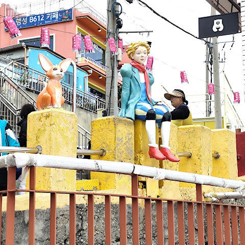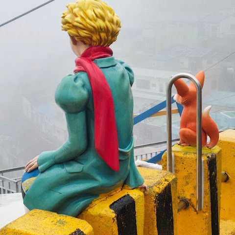 감천동 문화마을은 날씨가 좋지 않고 안개가 짙으면 "어린 왕자와 달"과 "어린 왕자와 여우" 뒤편의 알록달록한 오두막들이 보이지 않습니다. 한복을 대여해 주고(패스카드 사용 가능), 어린 왕자와 여우와 함께 사진을 찍으려는 사람들이 (어떤 사람들은 한복을 입고) 줄을 서 있어 긴 줄이 생기기도 합니다.