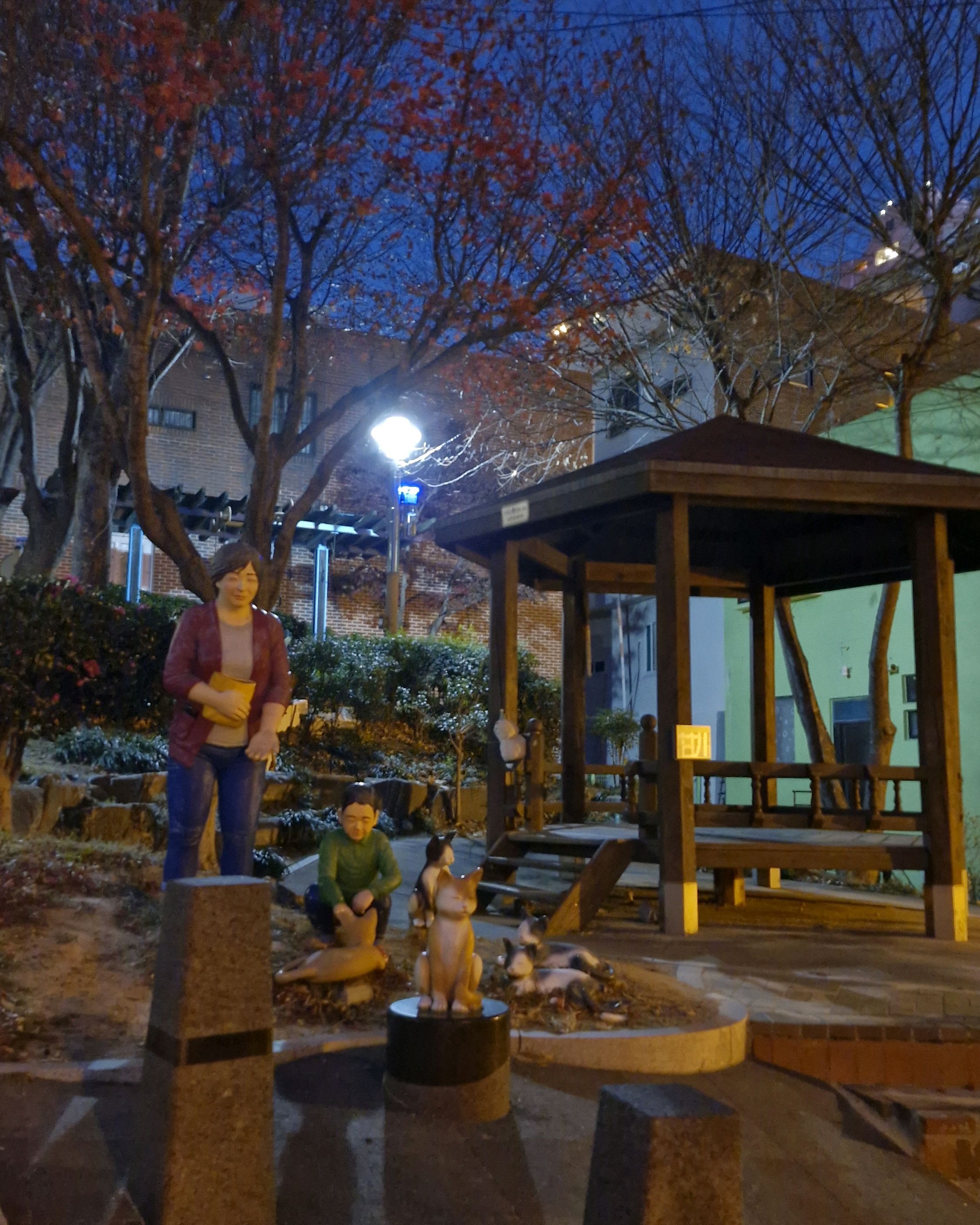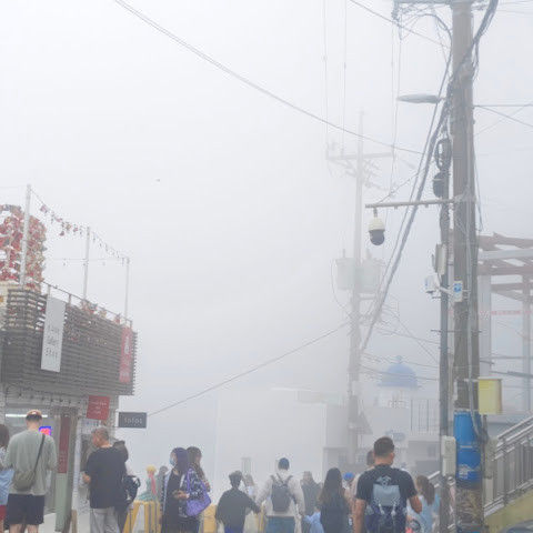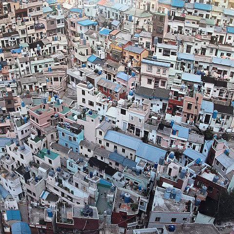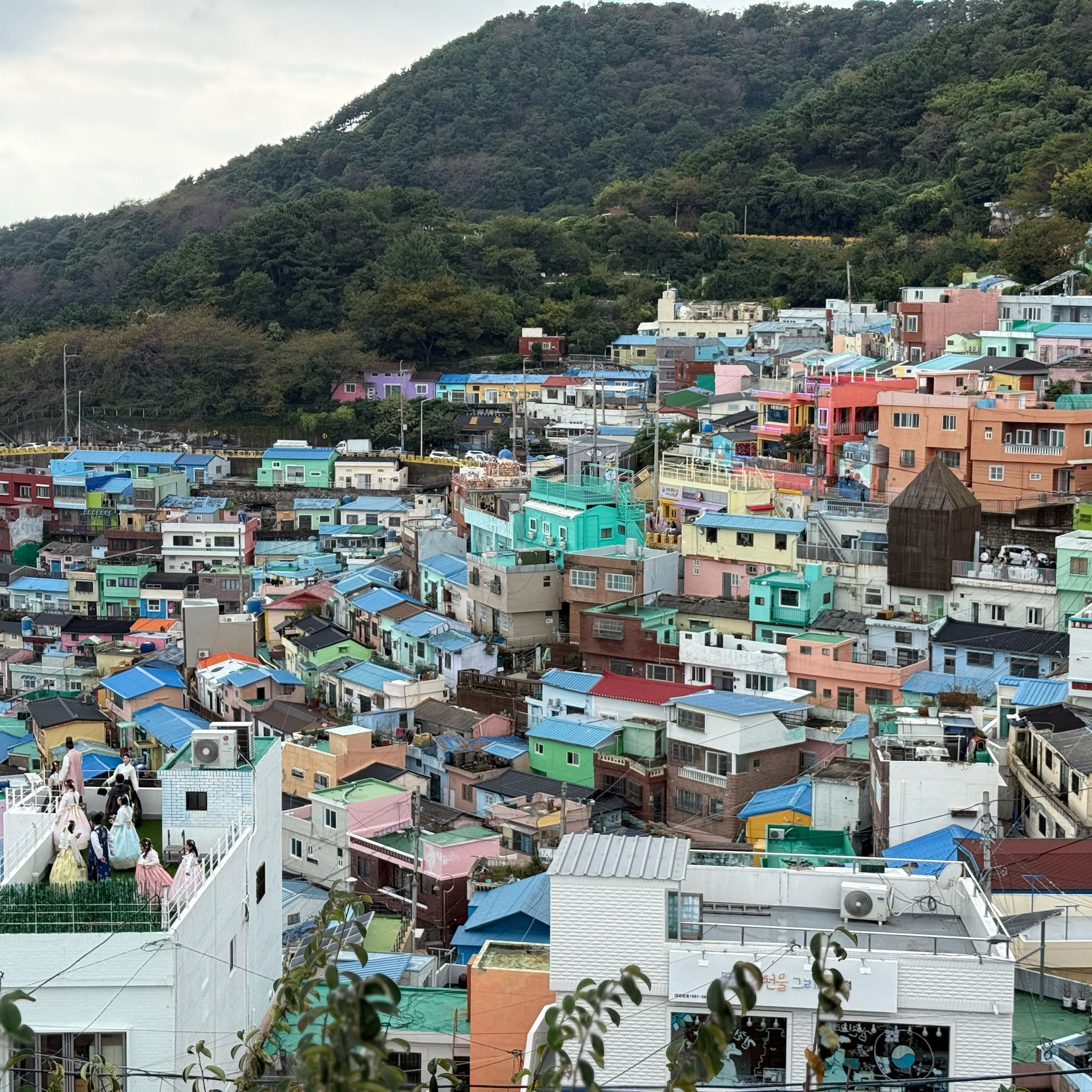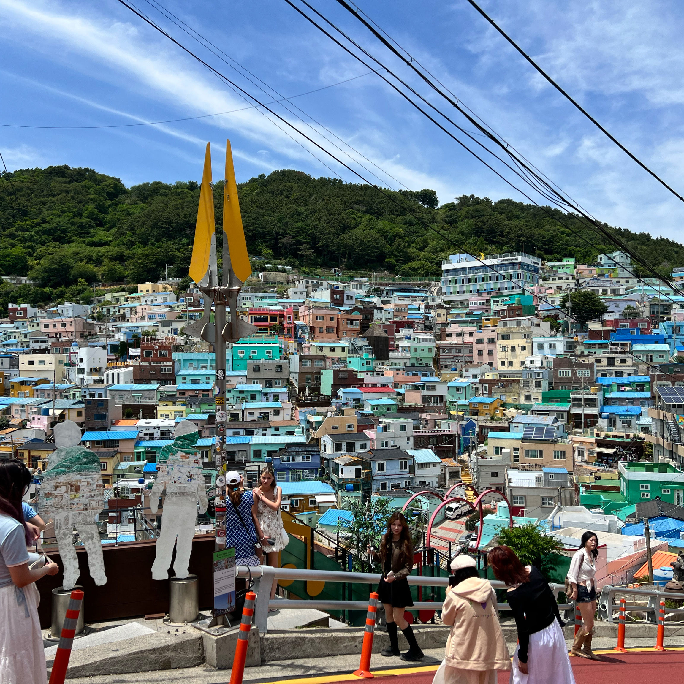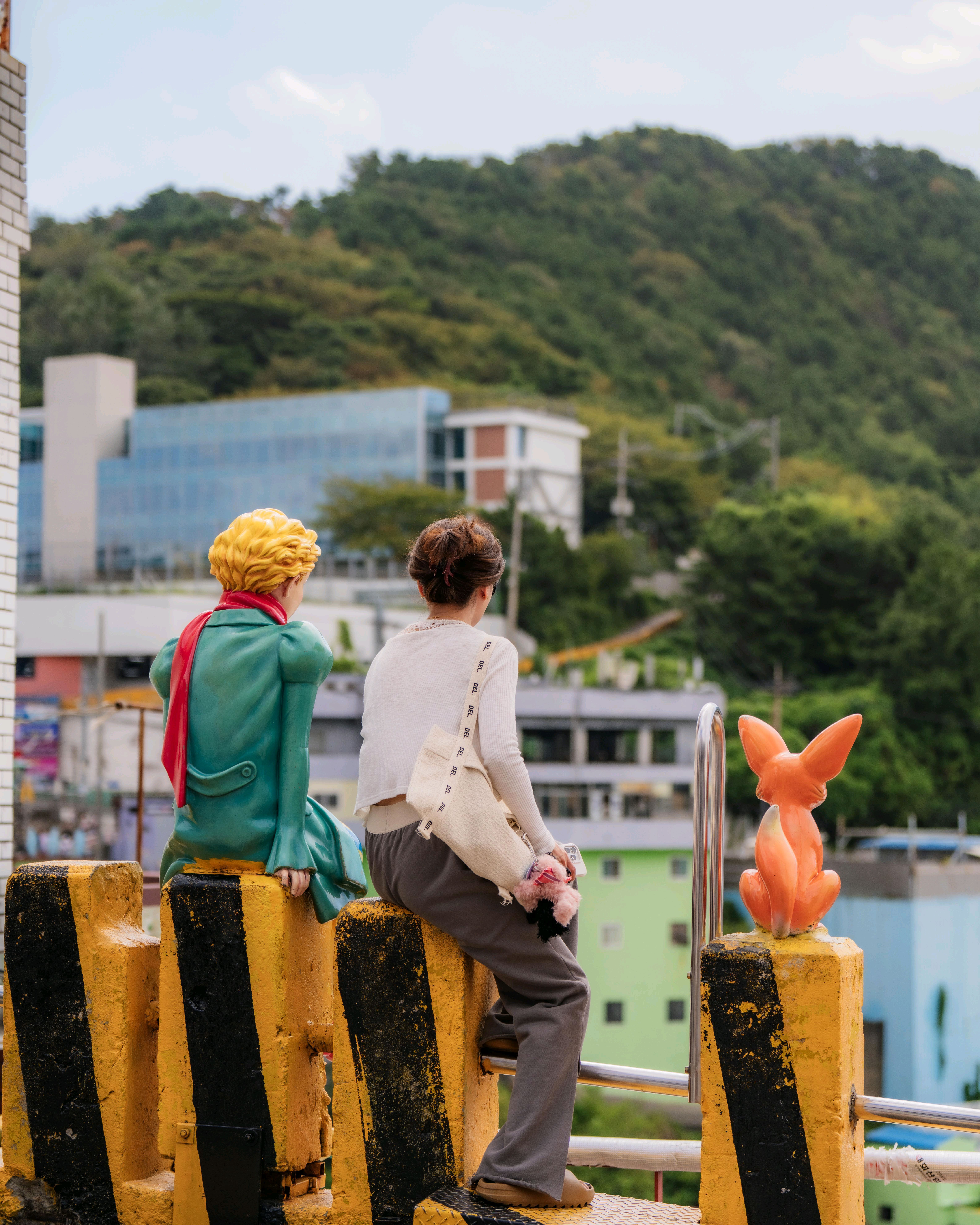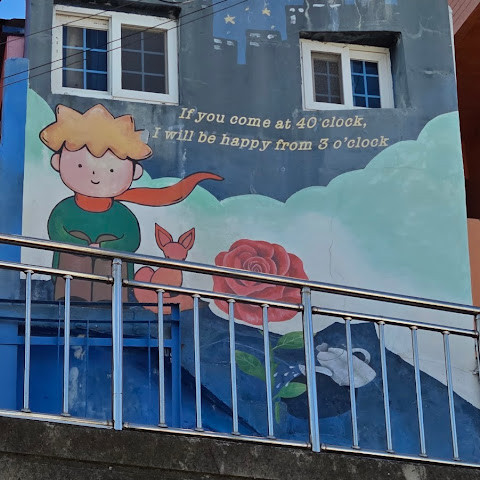 감천동 문화마을은 날씨가 좋지 않고 안개가 짙으면 "어린 왕자와 달"과 "어린 왕자와 여우" 뒤편의 알록달록한 오두막들이 보이지 않습니다. 한복을 대여해 주고(패스카드 사용 가능), 어린 왕자와 여우와 함께 사진을 찍으려는 사람들이 (어떤 사람들은 한복을 입고) 줄을 서 있어 긴 줄이 생기기도 합니다.