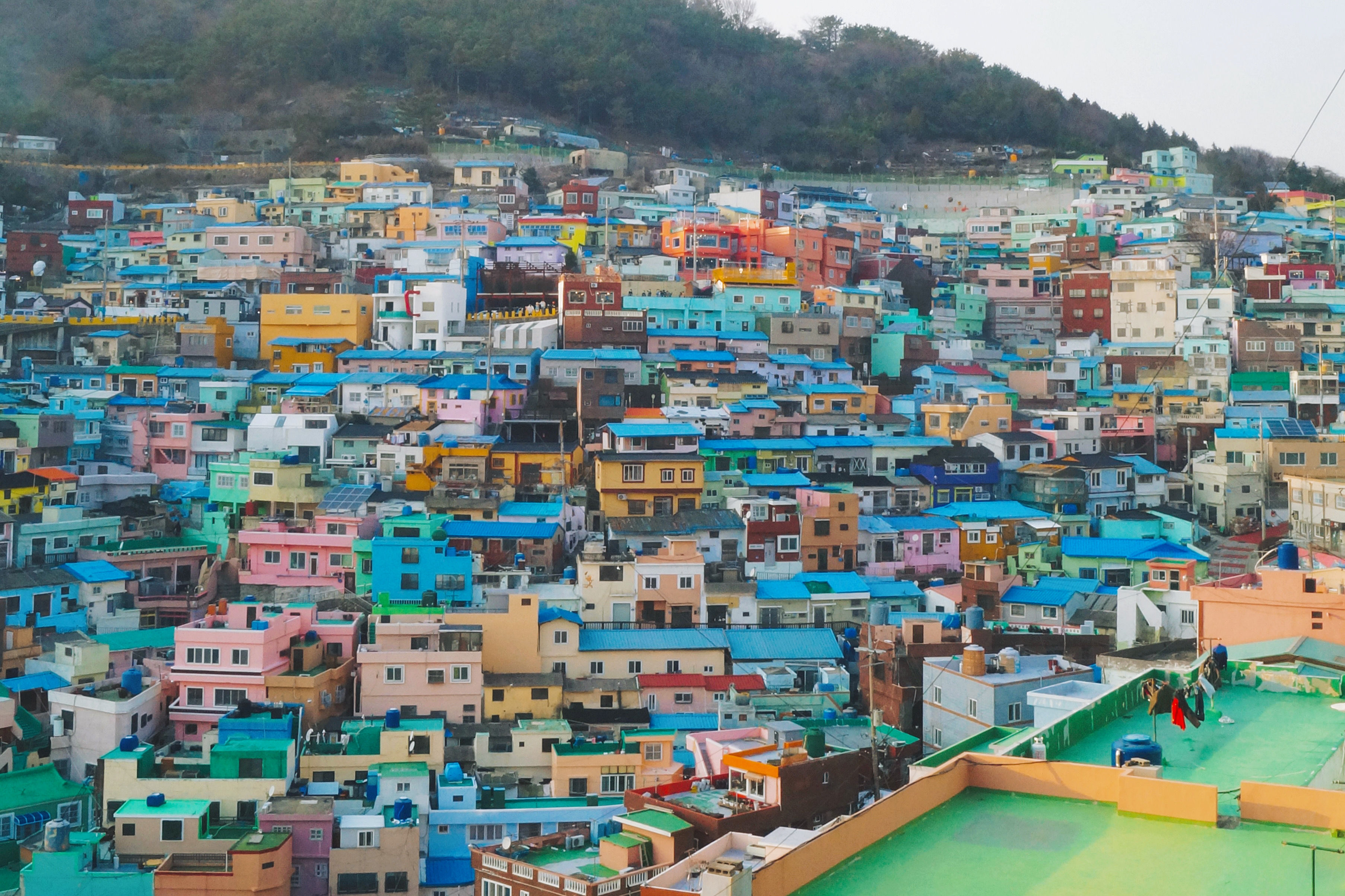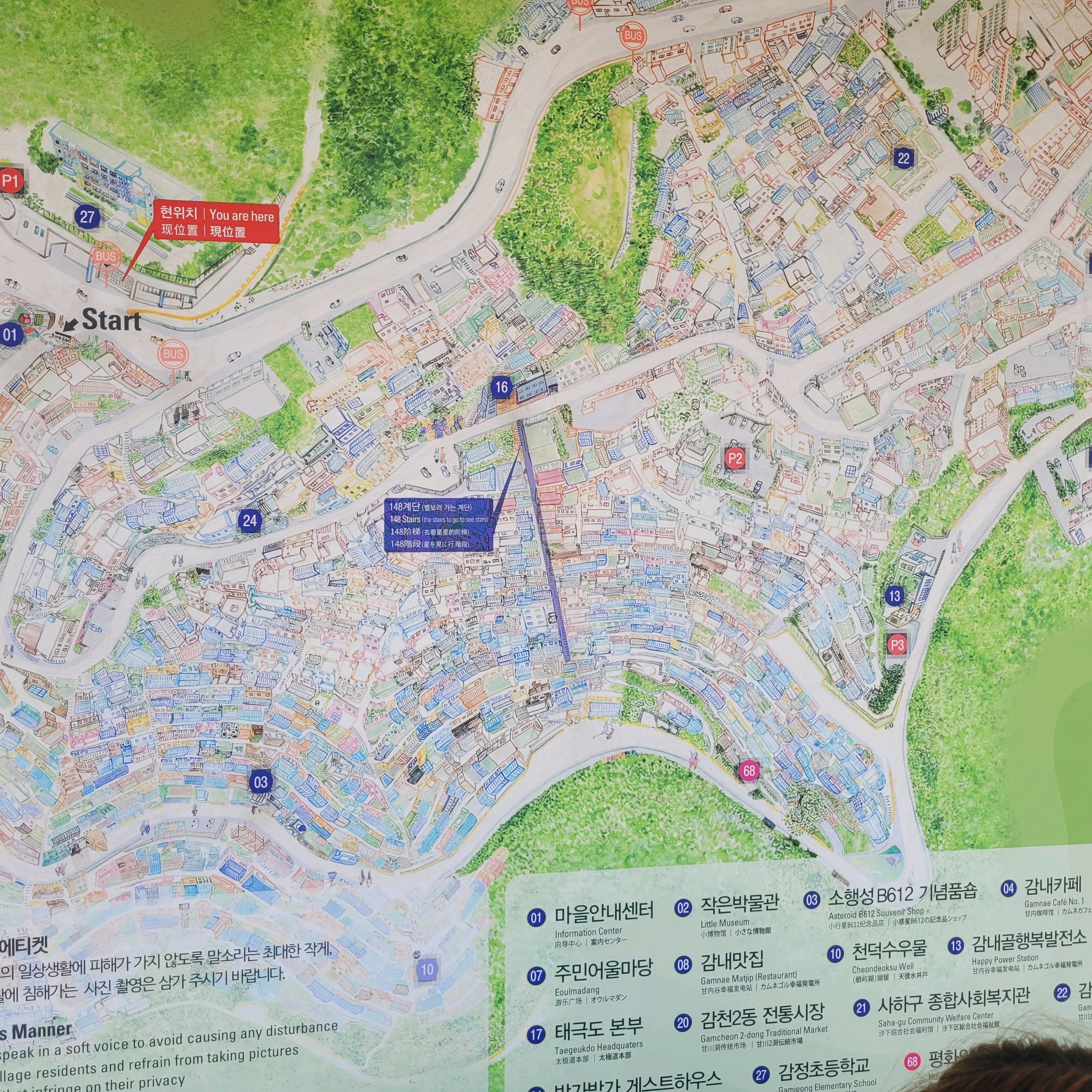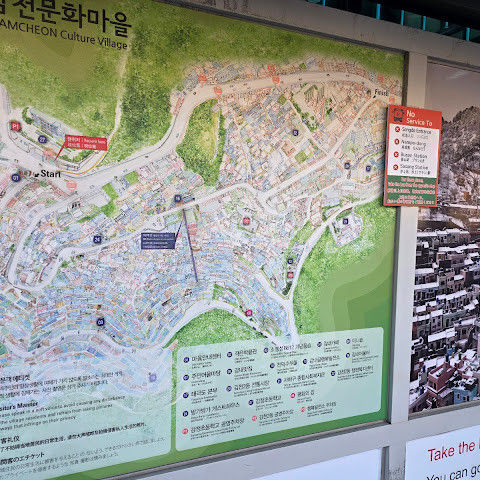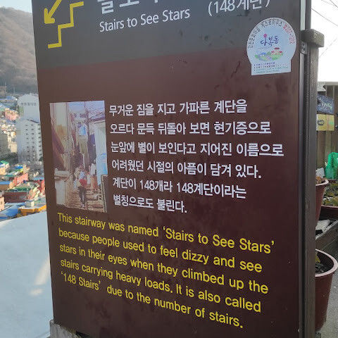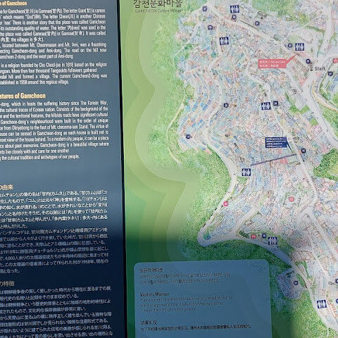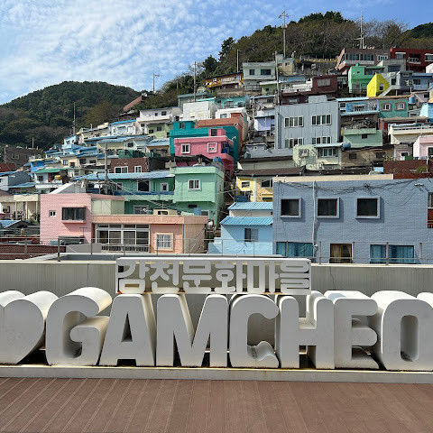 부산의 옛 슬럼가였던 이곳은 도시의 다른 지역과 대조되는 화려한 곳입니다. 놀랍고 독창적인 풍경 덕분에 관광객이 많이 찾는 곳이지만, 동시에 실제로 사람들이 살고 있는 곳이기도 합니다. 마을 입구에 있는 관광안내소에서 추천하는 세 가지 코스 외에도, 작은 골목길을 따라 걷다 보면 숨겨진 비밀 장소들을 발견할 수 있습니다. 경사가 매우 가파르기 때문에 유모차 등으로 갈 수 있는 추천 코스를 따라가지 않는 한 계단이 많습니다.