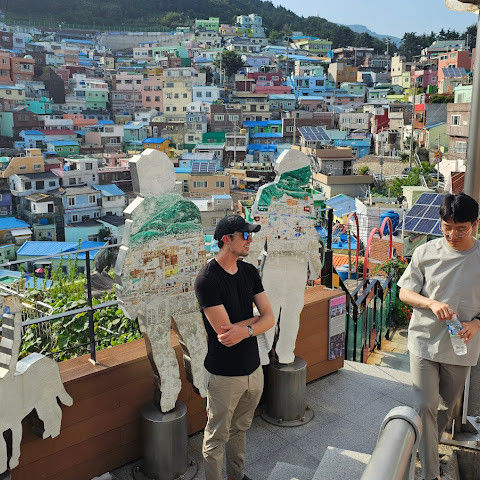감천문화마을은 정말 아름다워서 꼭 가봐야 할 곳입니다. 가게들이 언제 문을 여는지 몰라서 아침 일찍 도착했는데, 마을이 한적해서 정말 좋았습니다. 운동하는 친절한 주민들을 많이 만났고, 유명한 사진 촬영 장소도 둘러볼 수 있었습니다. 마을 뒤편 꼭대기에 있는 스포츠 건물 밖에 앉아 있기도 했습니다. 건물 꼭대기에는 전망대가 있었는데, 원래는 오전 9시에 문을 열 예정이었는데, 건물 직원분들이 친절하게 안내해 주시고 옥상까지 개인 에스코트까지 해 주셨습니다. 저희는 마을 전체를 직접 둘러볼 수 있었습니다! 마을은 무료로 방문할 수 있고 항상 열려 있습니다. 하지만 가게와 식당은 오전 9시에야 문을 엽니다.