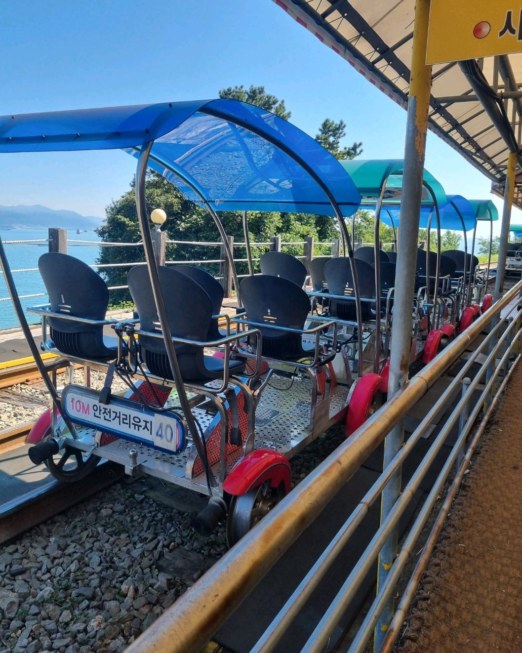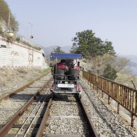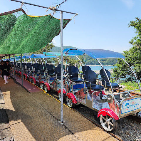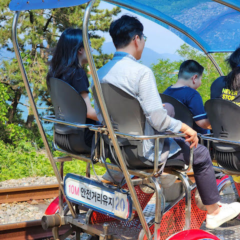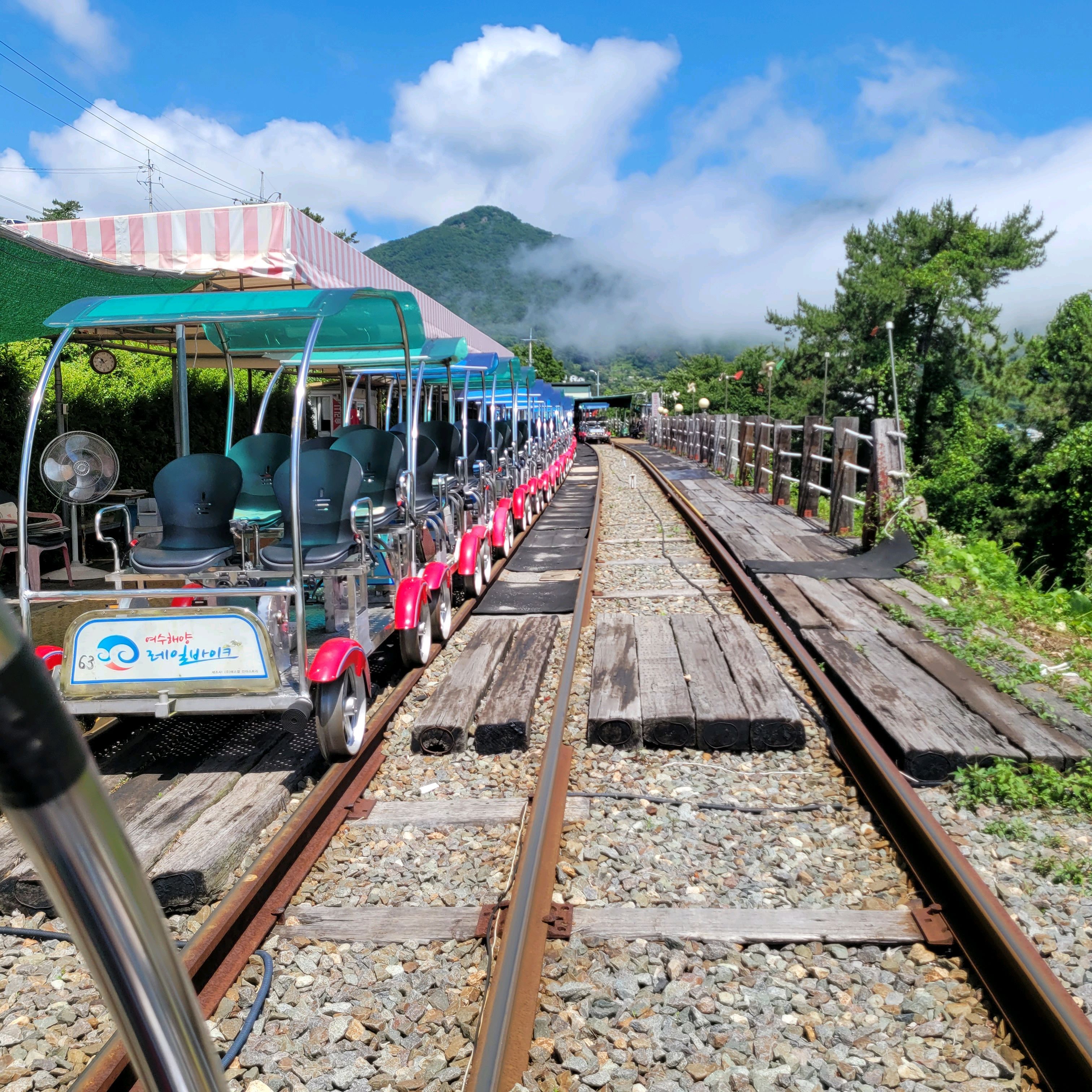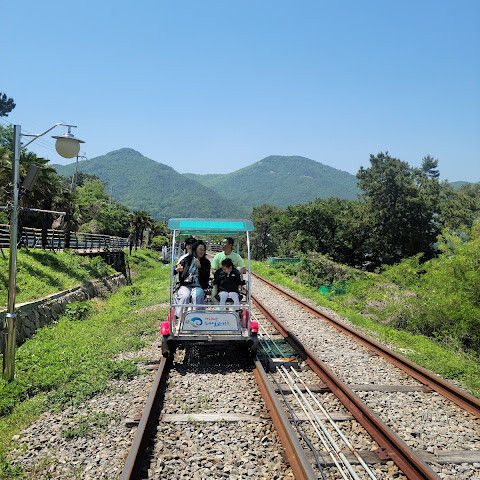 오래전에 다녀왔고 가족이나 연인들끼리 레일바이크타고 즐기기에 좋아요 레이바이크타고 여수만성리 바닷가를 쳐다보면서 즐기기에 딱 좋고 레일바이크 타면서 폐달돌리는데 나이먹은사람들은 근력이 부족하여 레일바이크가 잘 안나가요 자전거타듯이 돌리는데 잘 안나가요 타면서 안전하게 즐기시면 됩니다