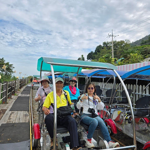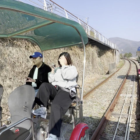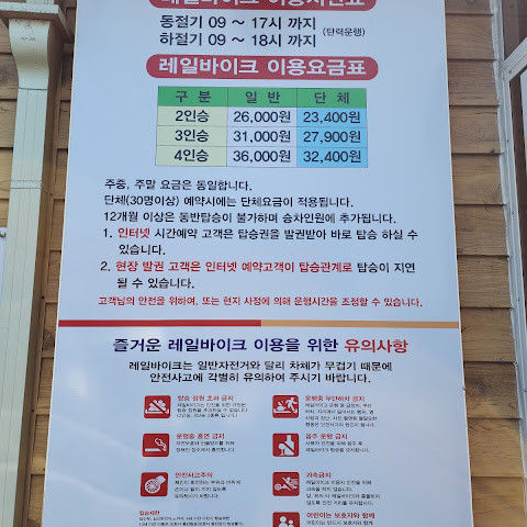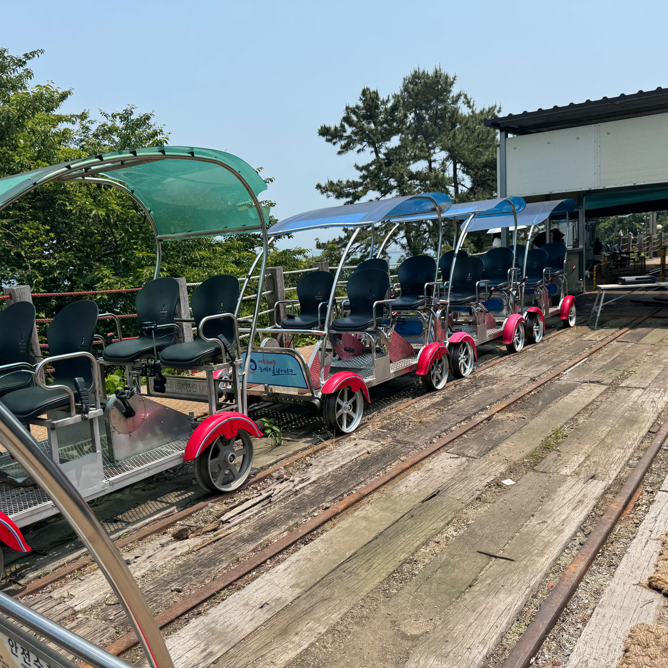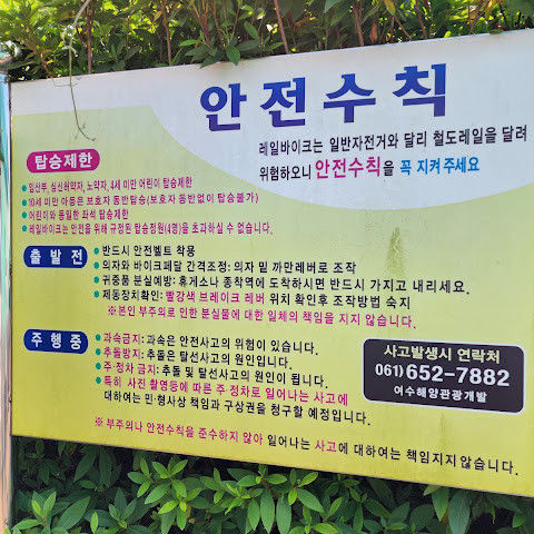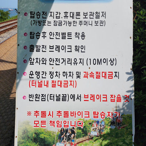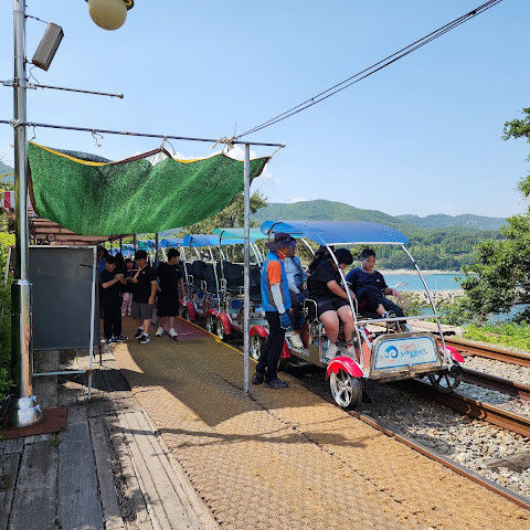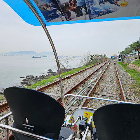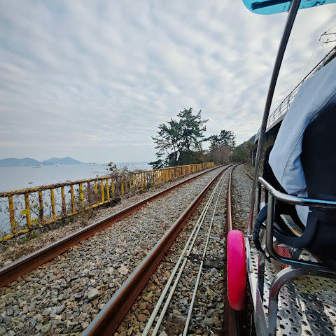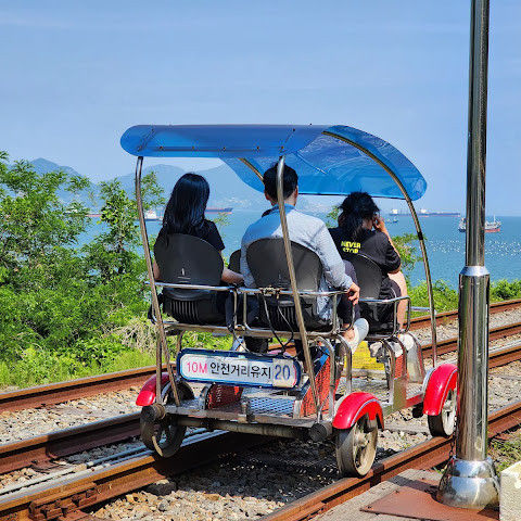 오래전에 다녀왔고 가족이나 연인들끼리 레일바이크타고 즐기기에 좋아요 레이바이크타고 여수만성리 바닷가를 쳐다보면서 즐기기에 딱 좋고 레일바이크 타면서 폐달돌리는데 나이먹은사람들은 근력이 부족하여 레일바이크가 잘 안나가요 자전거타듯이 돌리는데 잘 안나가요 타면서 안전하게 즐기시면 됩니다
