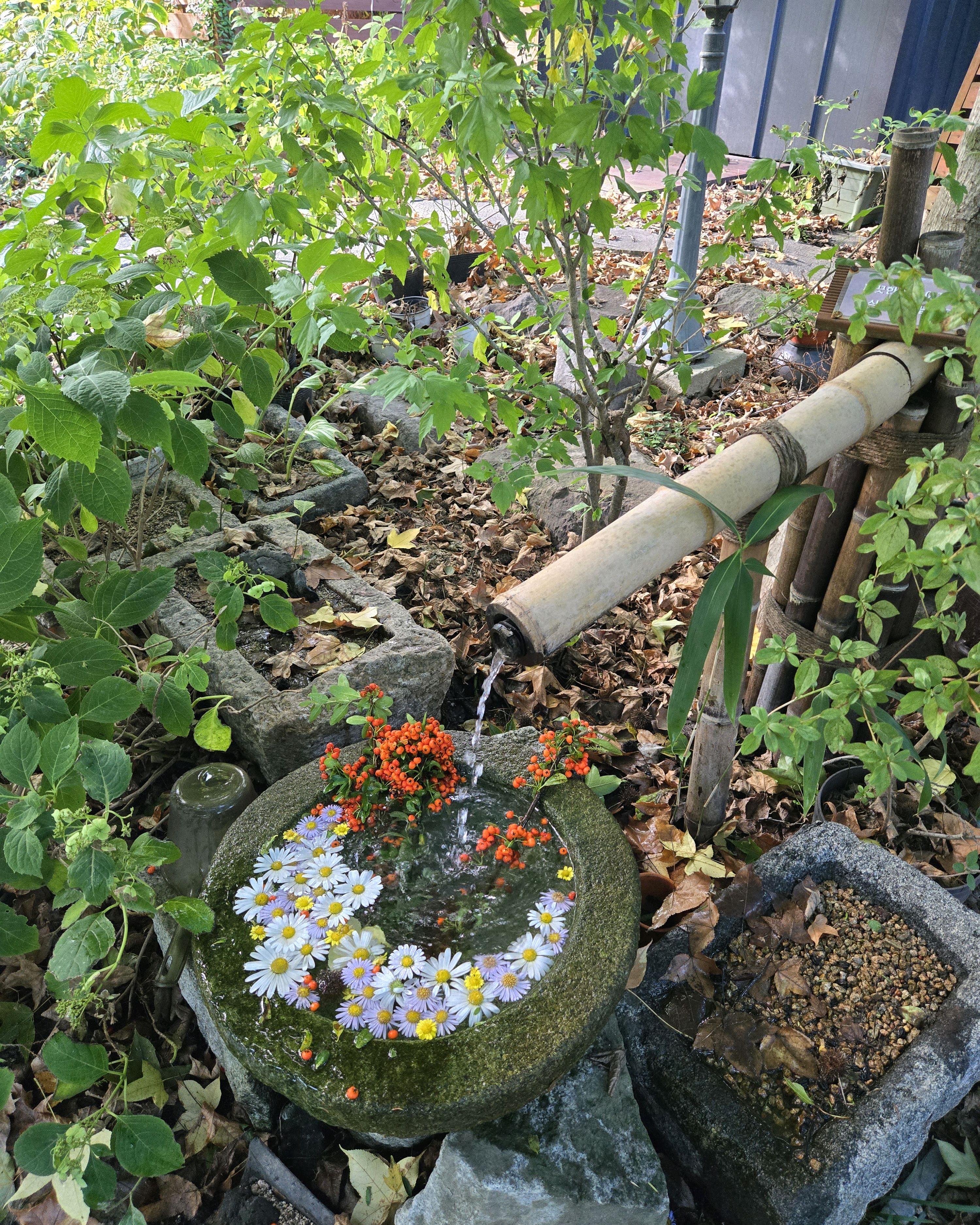 돌항아리 물그릇에는 가을 열매와 꽃잎이 떠 있어 마치 자연이 만든 작은 정물화 같았고, 잔잔한 물소리와 함께 마음까지 맑아졌습니다.