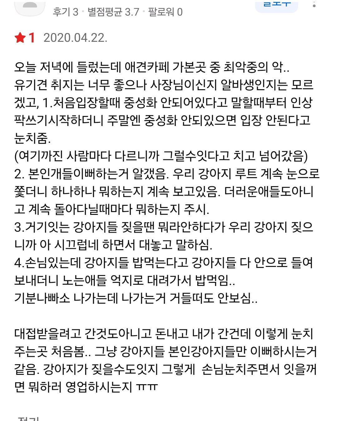 재작년도 왔었지만 개들이 사람다빠지고 아무도없어도 너무 시끄럽고 오줌냄새 진동하고 개카페가 좋은지 몰랐어요 다른곳가니까 짖지도않고 청결했는데 여기가문제인것같네요 제가 개 물림사고 2번이나 당해본적이 있어도 개좋아했는데요. 그때문에 다가오거나 짖으면 움찔해요. 사장님이 개한테 짖지마라 하거나 뭐 뭐그러는줄 알았는데 저한테 계속 욕을하신건가요? 개보고 왜그래 그러지마 하면서 반말로 뭐라뭐라 하니까 개한테 그러는줄알았는데 다시방문하니 저한테 그런거더라고요? 개한테 시비턴다고 하셨는데 그건 사장님이 아니신가요.. 아무리안좋아도 별점 좋게남기지만. 여기는 진짜 아니네요 성격이 정말 나쁘십니다.. 손님한테 그런식으로 하는것도 하는거지만 개 교육을 시켜주셨으면 합니디 한 푸들은 얌전하던데 얘때문에 참고버틴겁니다;