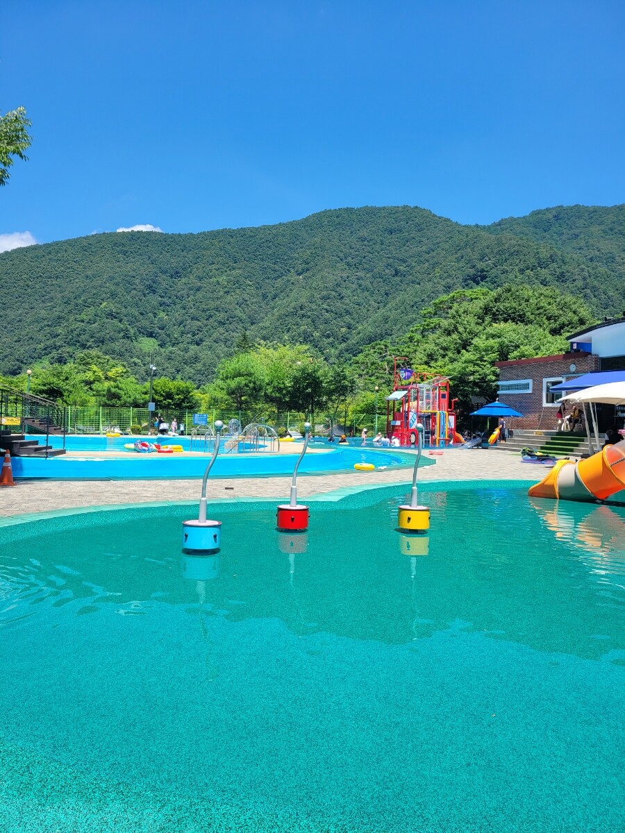 울창한 산을 바라보며 물놀이라니. 신선놀음이 따로 없습니다. 게다가 음식반입도 가능하고 시간도 무제한...감동이에요. 지자체가 운영해서 그런지 실리보다는 공익을 추구하는 느낌이 들었어요.