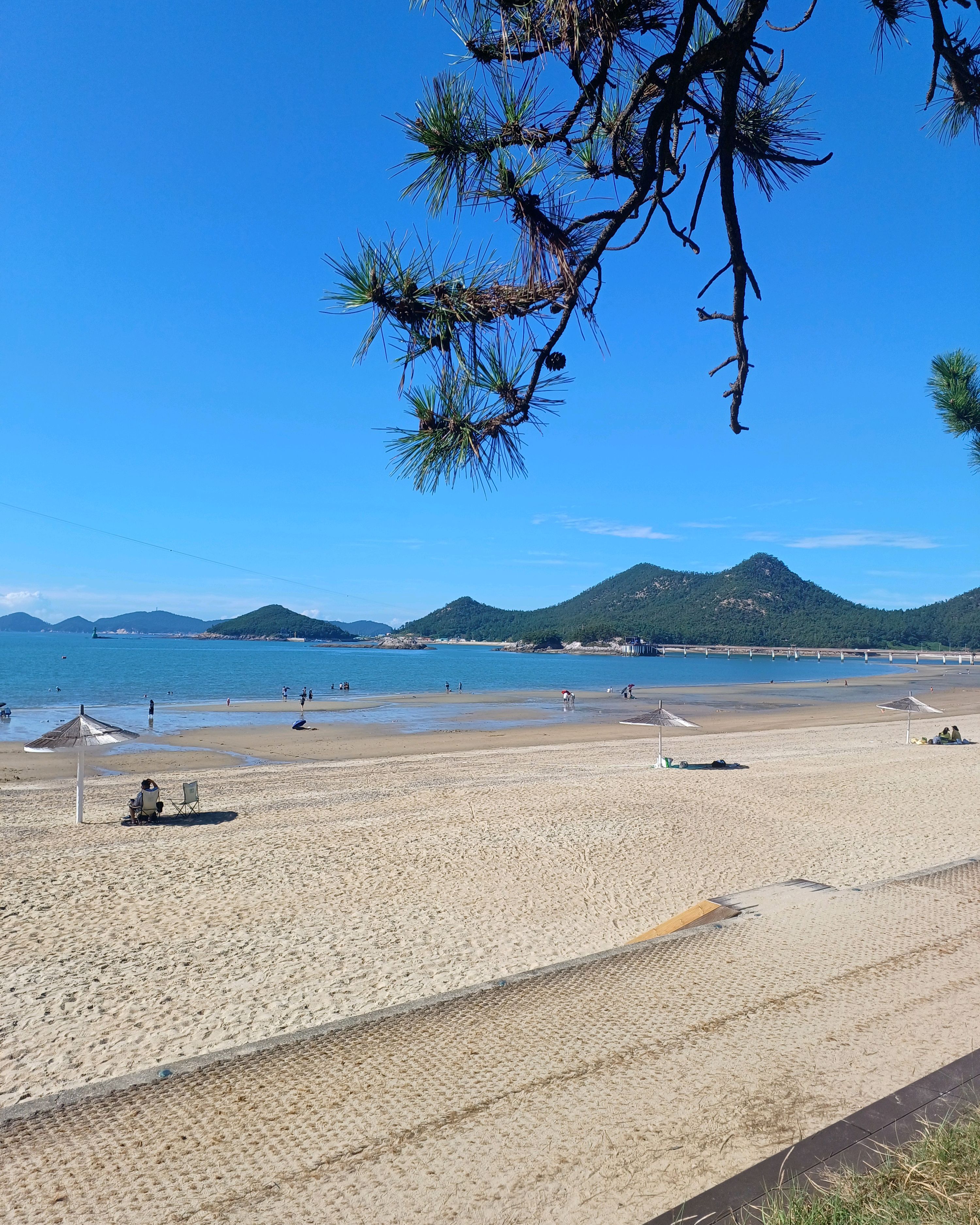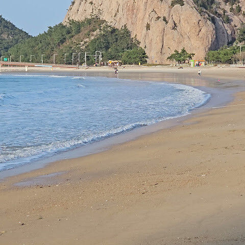 휴가철이 지나 북적거림은 없음. 몇개의 파라솔과 약간의 솔밭과 그 밑의 정자. 작은 샤워장. 날씨가 맑아 푸른 하늘과 파란 바다가 예뻣음.