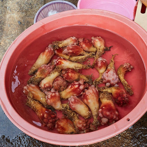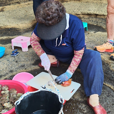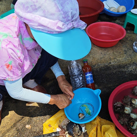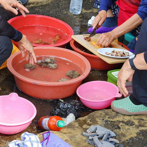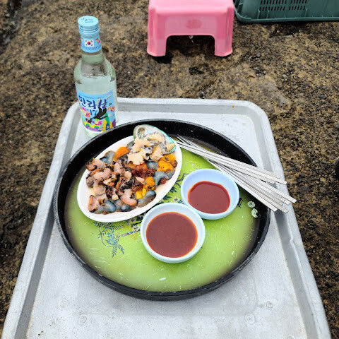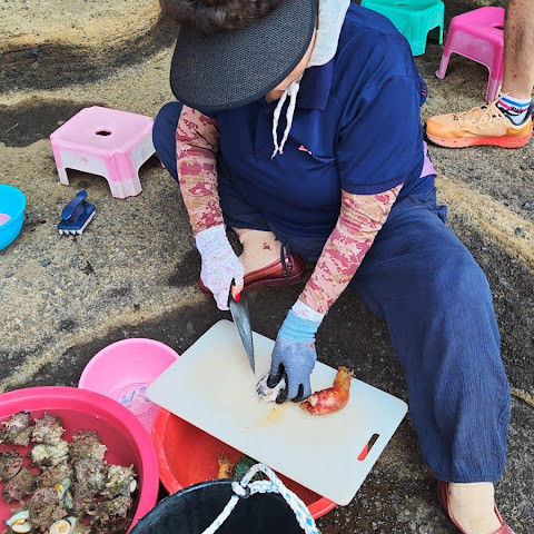 아직도 관광객들이 먹을 수 있도록 해산물을 가공하는 노점을 차리는 여성 다이버들이 많이 있습니다.
