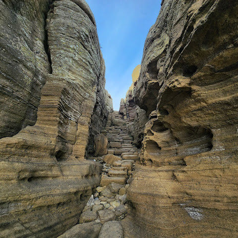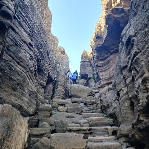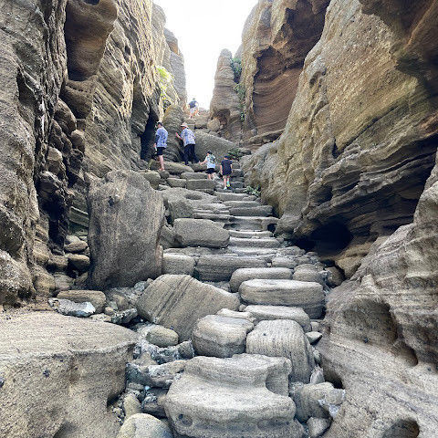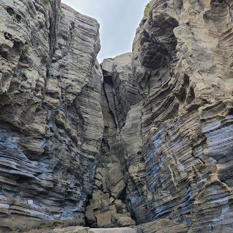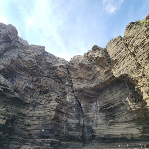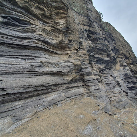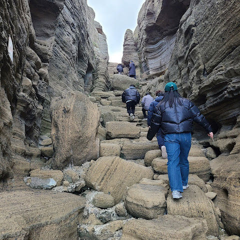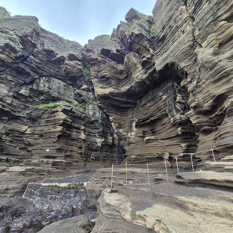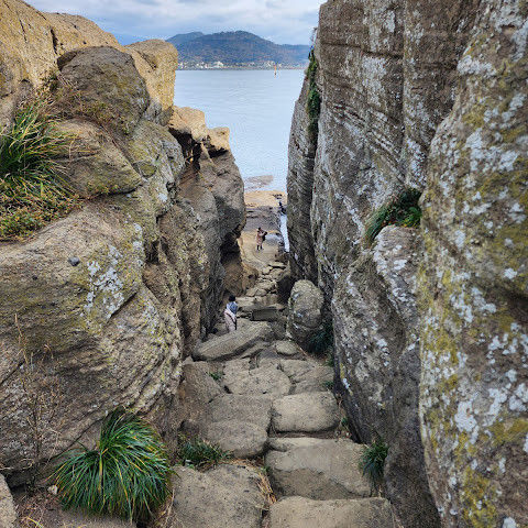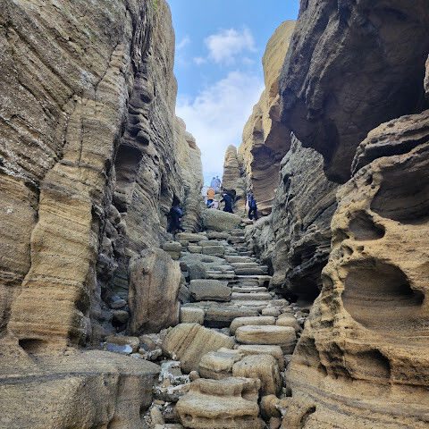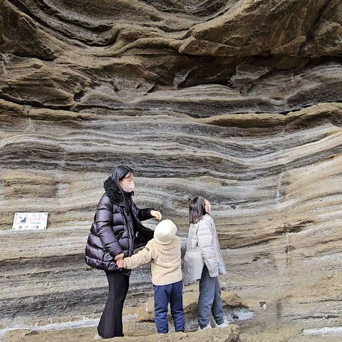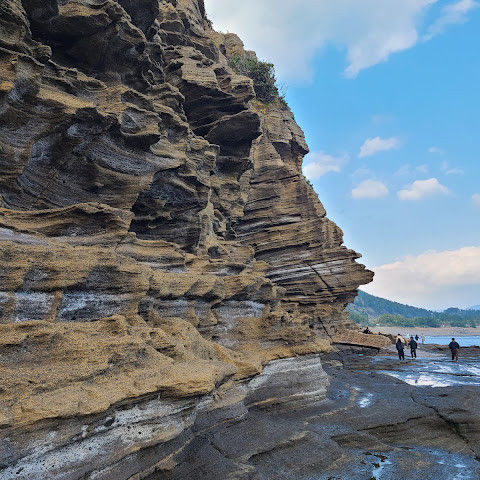 용머리해안은 정말 특별하고 황홀한 기암괴석들이 펼쳐져 있습니다. 두 번이나 방문했는데, 두 번 다 그 기암괴석에 매료되었습니다. 이번에는 문 닫기 15분 전에 입장했습니다. 밀물 때문에 개장 시간이 짧았고, 며칠 전부터 비가 내렸습니다. 그래서 방문할 수 있어서 정말 다행이었습니다. 창조주의 경이로움이 느껴집니다. 신선한 조개류를 파는 아주머니들을 봤는데, 제 위가 그렇게 튼튼할지는 의문입니다.