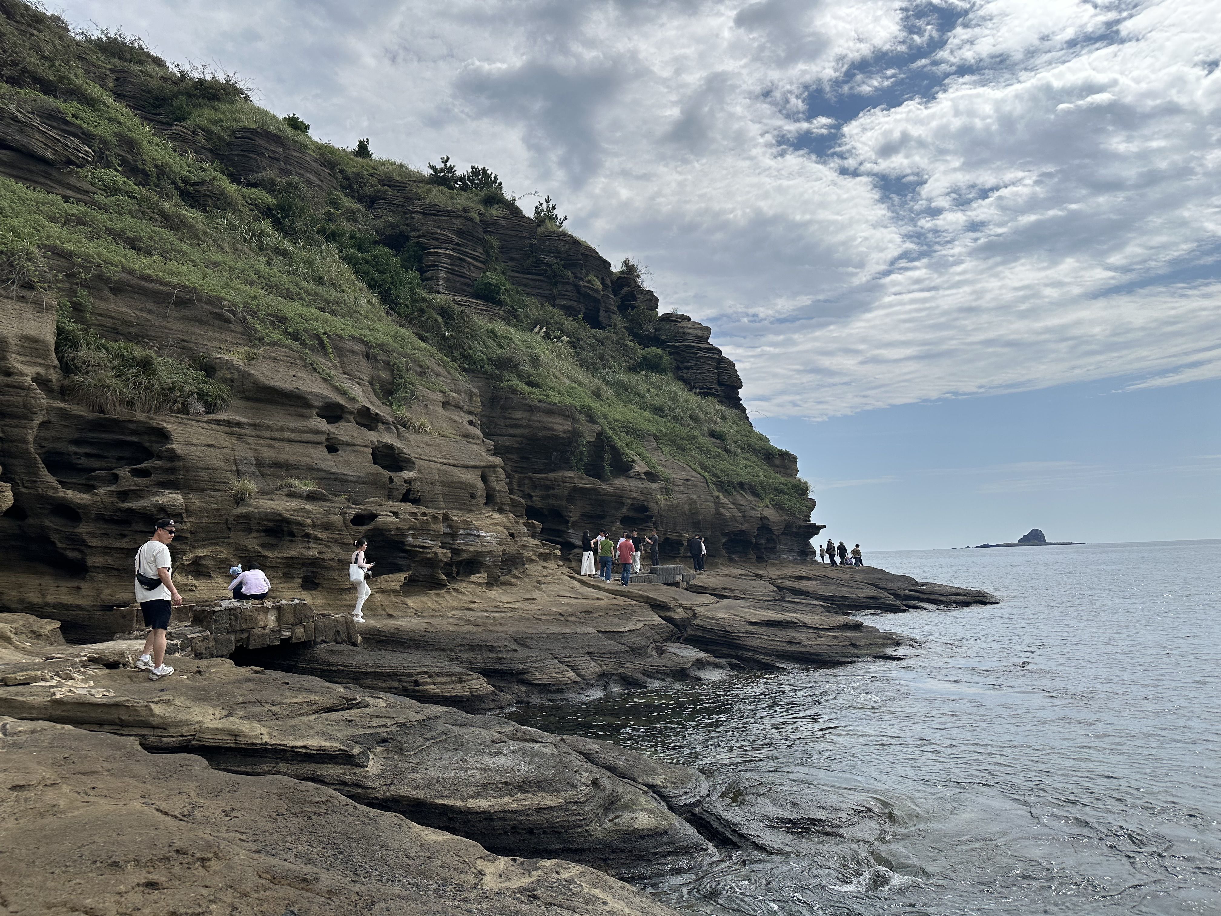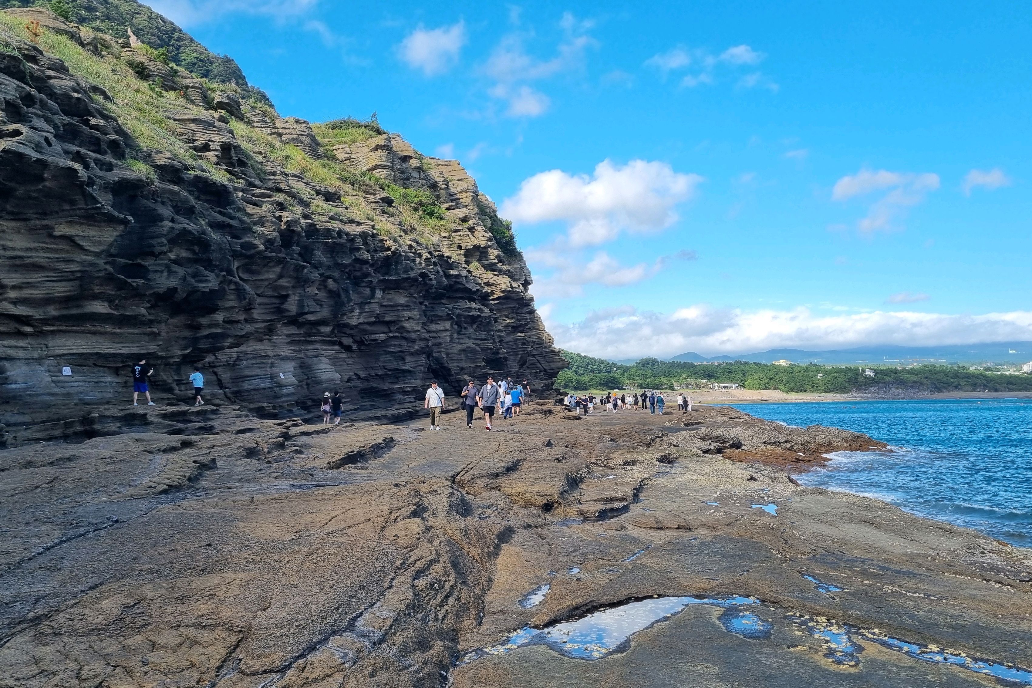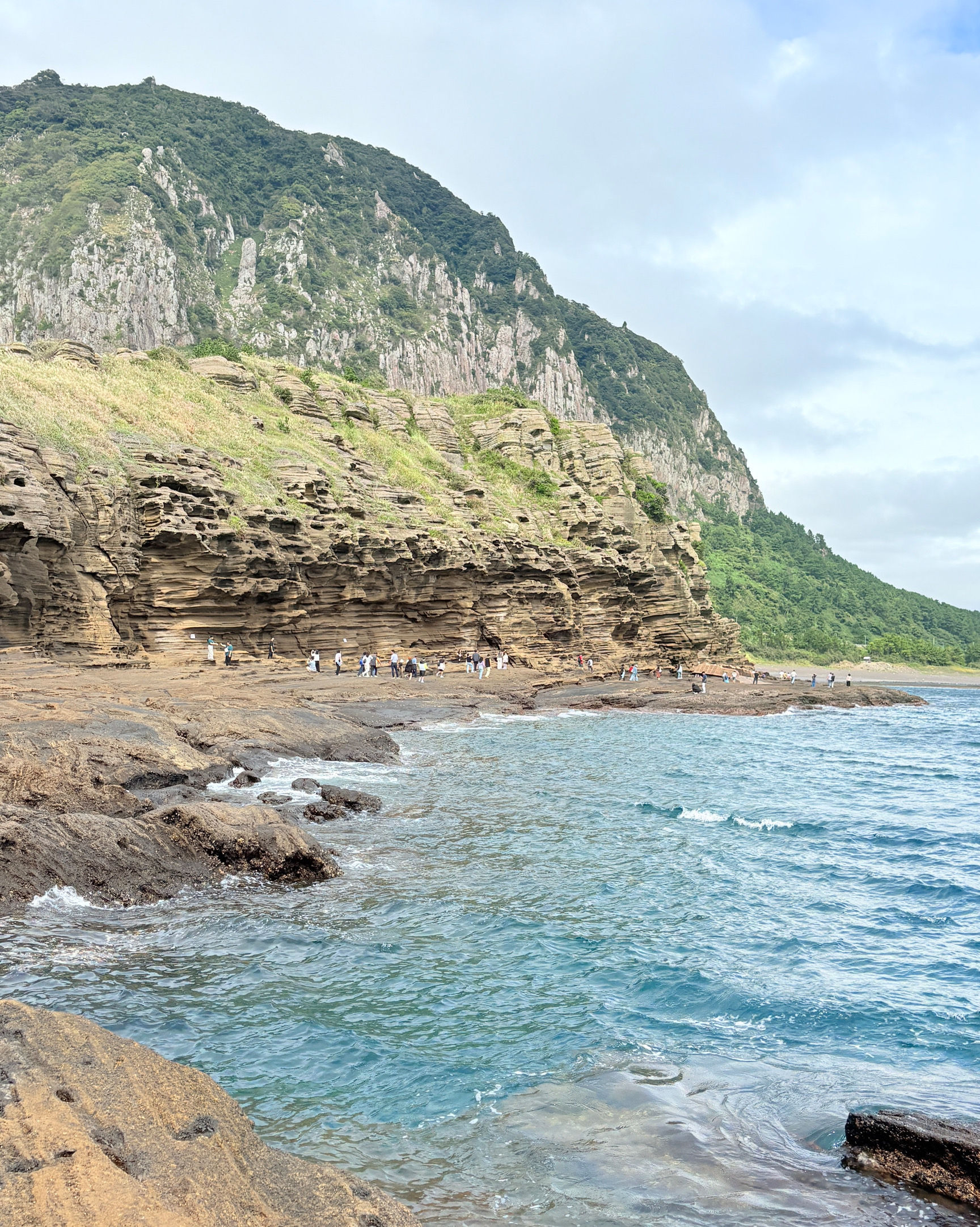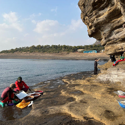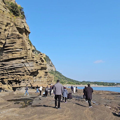 해안을 따라 꽤 먼 거리를 걸어야 하는데, 크록스를 신으면 발목이 아플 수도 있어요! 걷다가 해녀분들이 신선한 해산물을 파는 걸 보고 18년 전 고등학교 때 여기로 놀러 갔던 기억이 떠올랐어요. 그때는 일본 학생들이 많았고 훨씬 더 북적였죠! 이번에는 조수 때문에 용머리해안을 거의 못 갈 뻔했는데, 다행히 모든 게 잘 풀렸어요. 햇살이 눈부셨거든요.