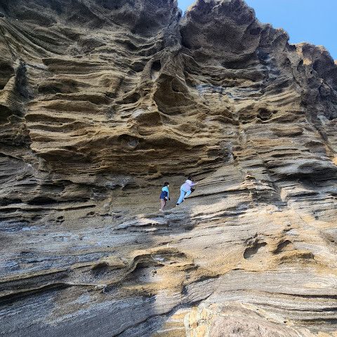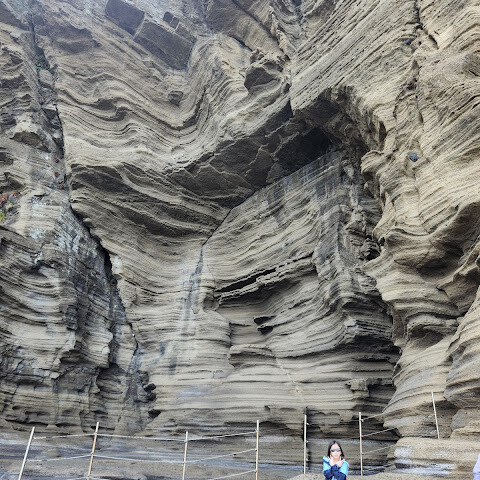 이곳의 풍경은 정말 놀랍습니다. 수천 겹의 화산 사암으로 이루어진 절벽은 특정 각도에서 자세히 보면 마치 손으로 조각한 예술 작품처럼 보입니다. 어떤 부분은 바다를 바라보는 세월의 흔적이 묻어나는 얼굴 같고, 또 어떤 부분은 돌 속에 얼어붙은 거대한 파도 같습니다. 마치 자연 조각 박물관을 걷는 듯한 기분입니다.
