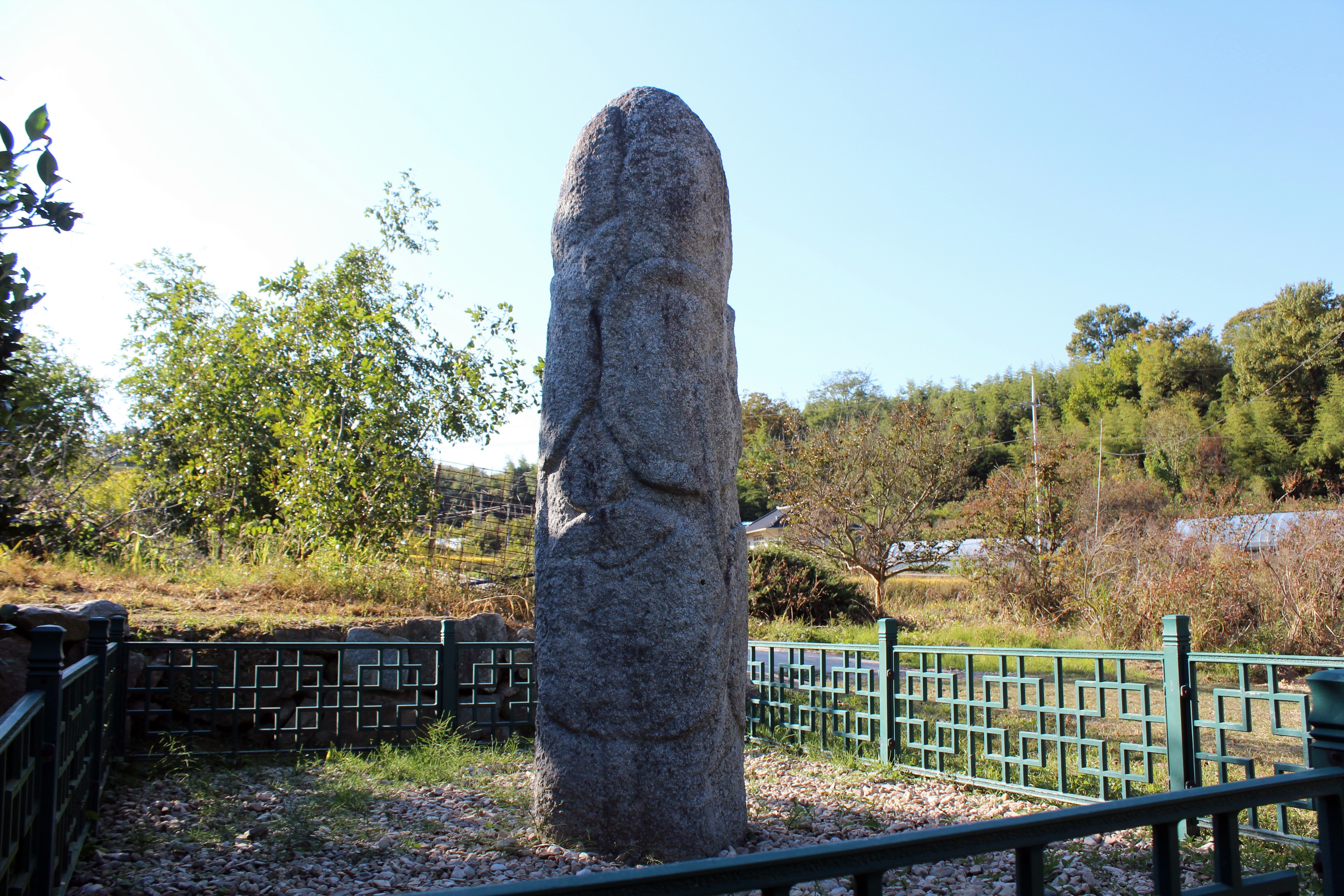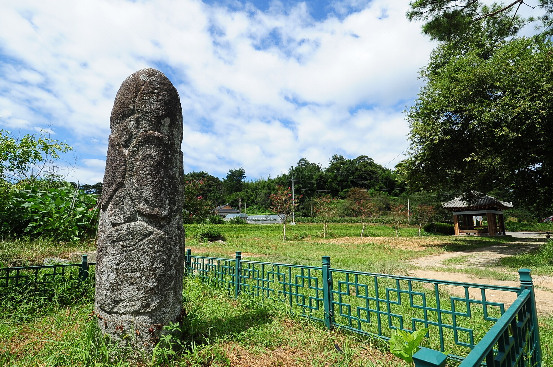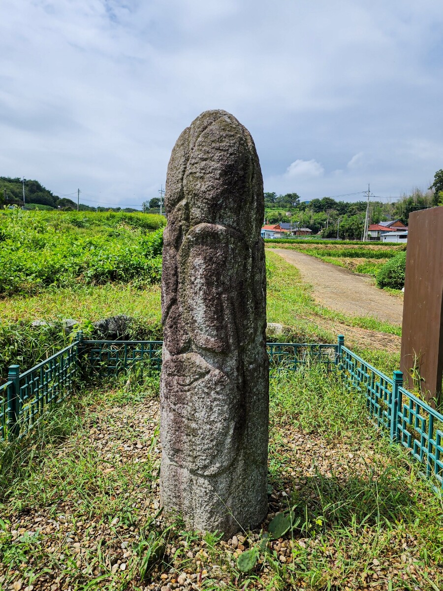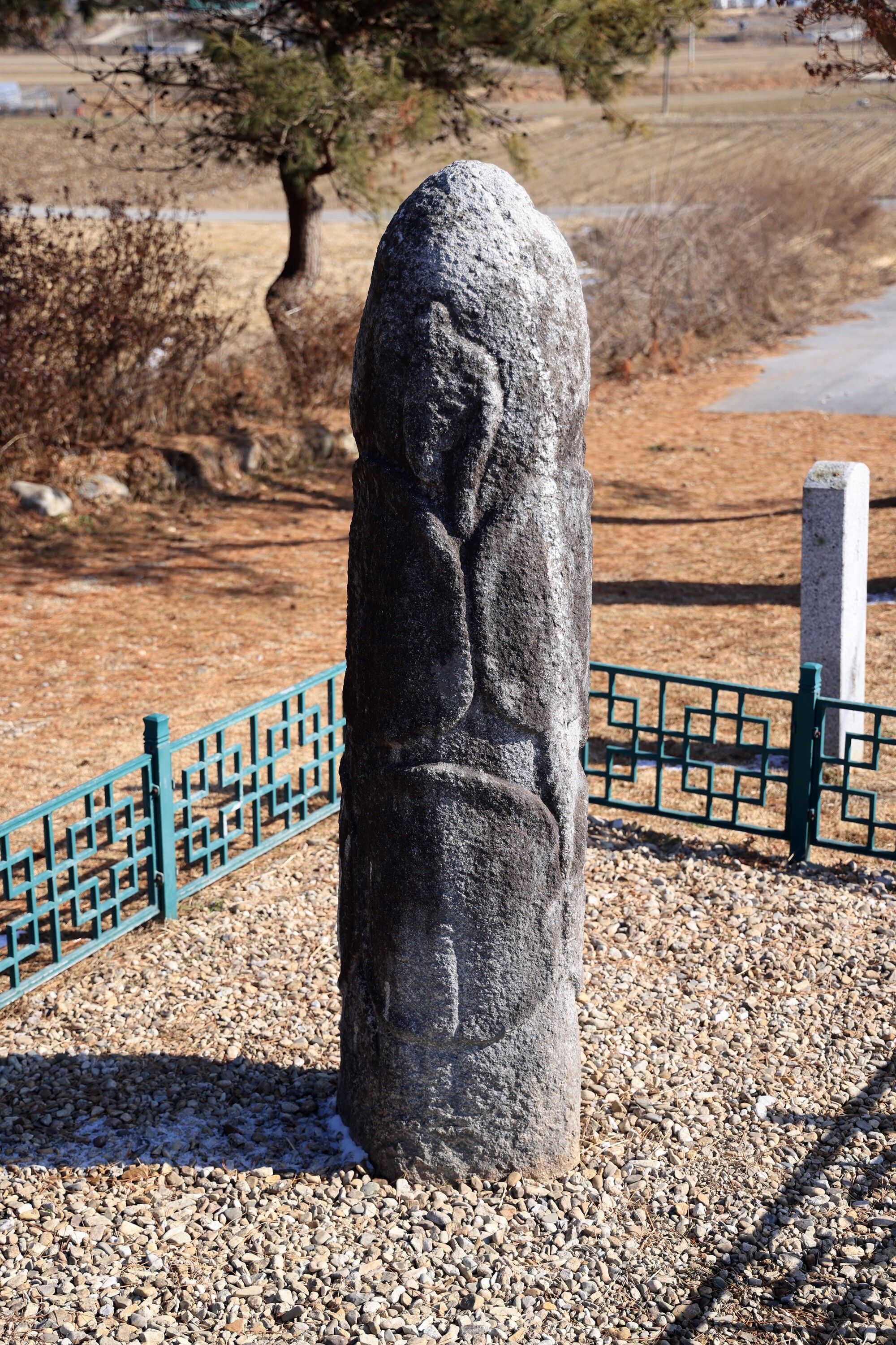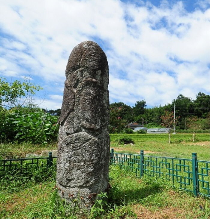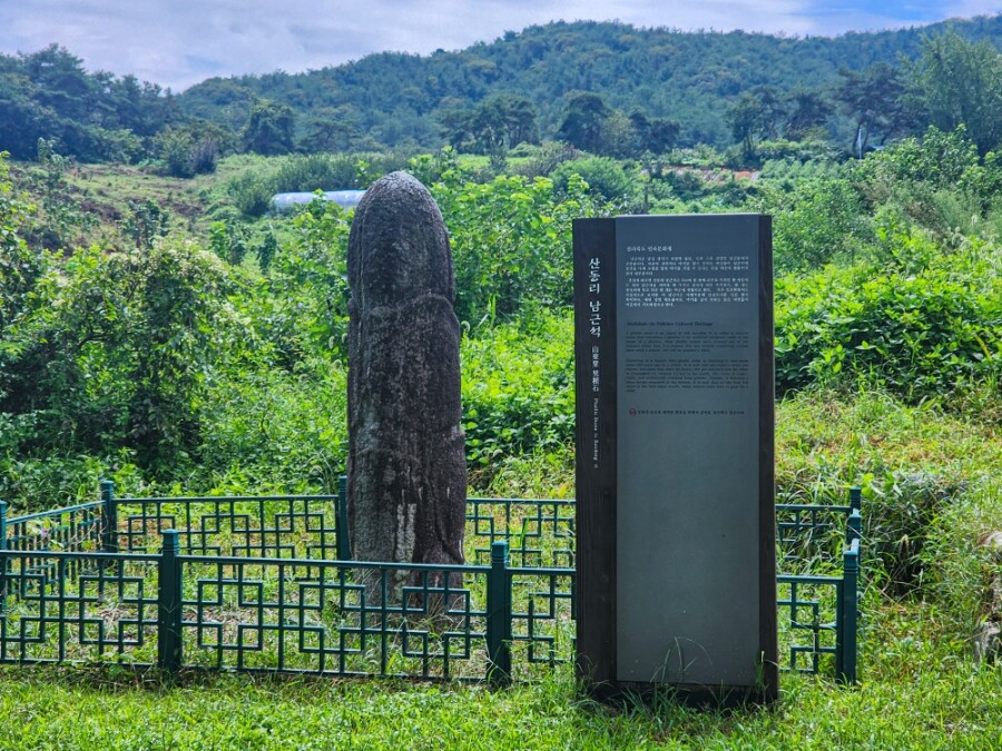 500여 년 전 여장사가 2기의 남근석을 차마에 싸가지고 오다가 무거워서 1기는 창덕리에 버리고 1기는 이곳에 세웠다는 이야기가 전해진다. 언제 세운 것인지는 정확히 알 수 없으나 다른 남근석에 비해 매우 섬세하게 조각되어 주목되는 작품이다. 이 조형 선돌을 남근석이라고 명명한 것은 마을 가운데에 여근곡이 있기 때문이다. 즉 산동리 남근석은 산동리 팔왕 여근곡[인정샘]과 마주 보는 마을 앞 전면에 세워 놓아 마을의 음기를 누르는 기능을 하고 있다. 연꽃잎이 조각된 쪽에서 바라보면 여근곡이 보이므로 여근곡의 음기를 누를 목적에서 세운 압승형 풍수 비보 선돌이라 할 수 있다.