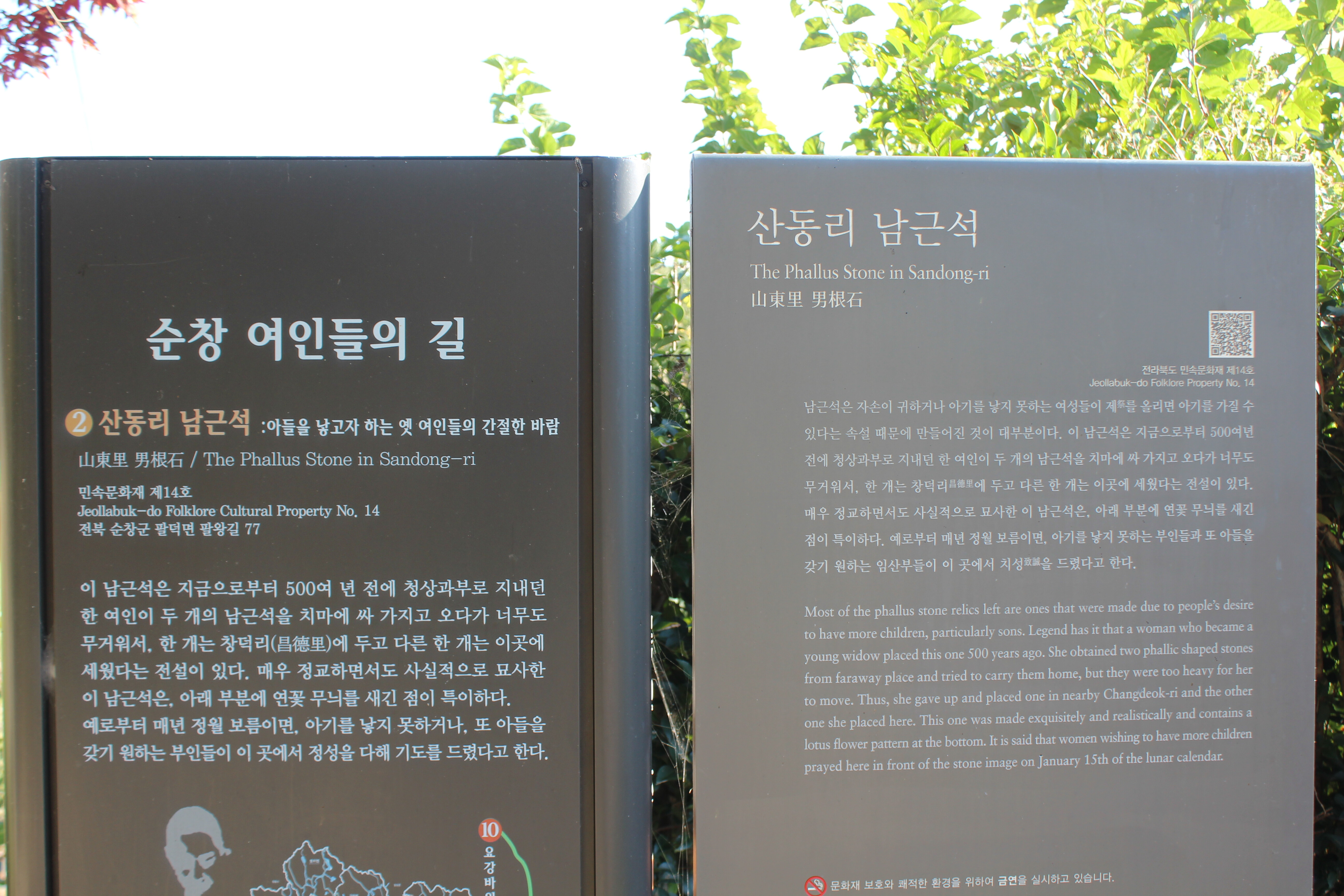 전라북도 순창군 팔덕면 산동리 팔왕 마을에 있는 산동리 남근석은 남자 성기 모양으로 자연 암석이나 암석을 조각하여 세운 것으로 복을 받거나 다산 풍농, 풍어를 기원하는 민간신앙의 대상이 되고 있다. 산동리 마을 앞 당산나무 부근에 자리한 이 남근석은 화강암으로 정교하게 조각되었다. 생김새는 건장한 남성의 성기가 충분히 발기된 모양으로 아랫부분에 연꽃무늬가 조각된 점이 독특하다.