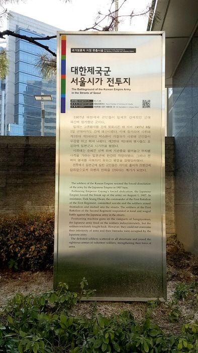 대한제국군 서울시가 전투지는 대한제국군의 신념이 있고 항일투쟁이 시작된 곳이다. 1907년 통감부가 대한제국 군대해산을 통고하자 제1연대 제1대대장 박승환이 그 소식에 격분해 [군인으로서 나라를 지키지 못하고 신하로서 충성을 다하지 못하였으니 만 번 죽은들 무엇이 아깝겠는가]라는 말을 남기고 자결을 택했다. 이를 본 장병들은 군대해산에 반대하는 장교들의 지휘에 따라 무기고를 부수고 총을 꺼내 일본군과 교전을 시작하였다. 대한제국군 장병들이 분투했으나 전력의 차이로 인하여 시가전은 일본군의 승리로 끝나고 말았다. 이 전투에서 대한제국군은 장교 11명 등 68명이 전사하고 100여 명이 부상을 입었다. 해산된 대한제국의 군인들은 의병에 합류했고 항일 의병의 전력이 예전과는 비교할 수 없을 만큼 강해졌다. 현재는 서울대한상공회의소 부지로, 건물 오른쪽 화단에 현충 시설 안내판이 설치되어 있다.