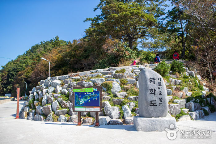 섬에 사계절 꽃이 만발하여 화도라 부르게 되었다고 전해진다. 북쪽 섬이 상화도이고, 남쪽 섬이 하화도이다. 하화도는 ‘아래꼬이섬’이라고도 불린다. 하화도에는 진달래, 찔레꽃, 유채, 구절초, 부추꽃, 원추리 등 온갖 꽃으로 가득하다. 하화도의 꽃과 아름다운 풍광을 즐길 수 있는 꽃섬길은 총 5.7km로, 해안선을 따라 섬을 한 바퀴 도는 코스다. 선착장에서 출발해 휴게정자 1, 휴게정자 2, 순넘밭넘구절초공원, 큰산전망대, 깻넘전망대, 꽃섬다리, 큰굴삼거리, 막산전망대, 큰굴삼거리, 애림민야생화공원을 거쳐 선착장으로 돌아온다. 일주하는 데 3시간 정도 걸리고, 험한 구간이 거의 없어서 초등학생 이상이면 누구나 걸을 수 있다. 하화도에서 가장 높은 큰산전망대에 서면 왼쪽으로 개도가, 오른쪽에는 고흥 외나로도를 조망할 수 있다.