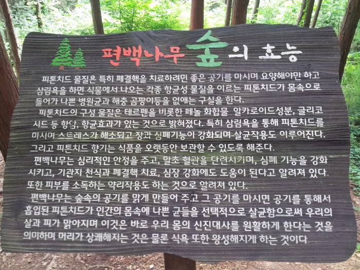 편백나무숲은 그저 걷기만 하는 숲이 아니다. 빽빽한 편백나무가 뿜어내는 짙은 나무 향으로 삼림욕 하며 머물러 쉬거나, 이야기를 나누면서 삶의 고단함을 잠시 내려놓을 수 있는 숲이고, 걸으면서 생활 속의 긴장과 스트레스를 날려 보내고 맑은 공기로 몸과 마음을 새롭게 할 수 있는 공간이다. 두동편백나무숲은 도심 속에 조성된 편백 숲과 달리 가는 길 내내 한적하고 여유로운 시골 마을의 정취를 느낄 수 있다.