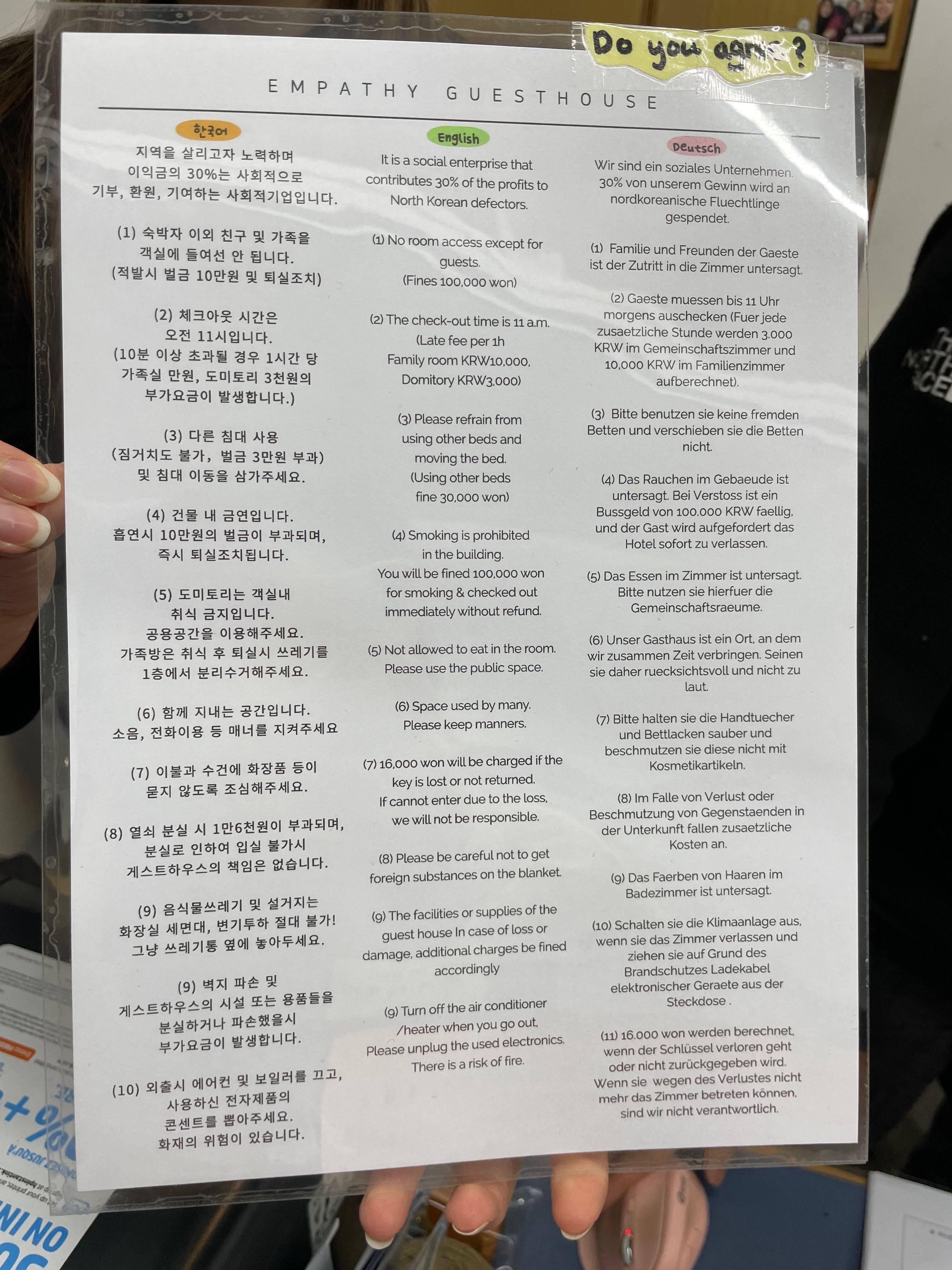 다른사람 들어올수도 있는데 소음있고 시끄러워서 창문 이불로 막은거보고 놀랬대서 사과했는데 왜 정작 게스트하우스측은 저녁7시넘으면 카운터 운영않한다고 온라인예약할때 이야기 않하나요? 2명이서 밖에서서 약30분정도 못들어가고 전회통화로 비밀번호 전달받아도 열리지도 않았는데 사과않하네요. 그리고 전화다시걸어도 받지도않습니다. 불친절 반성없음(찐후기)