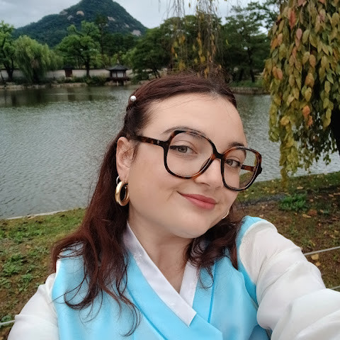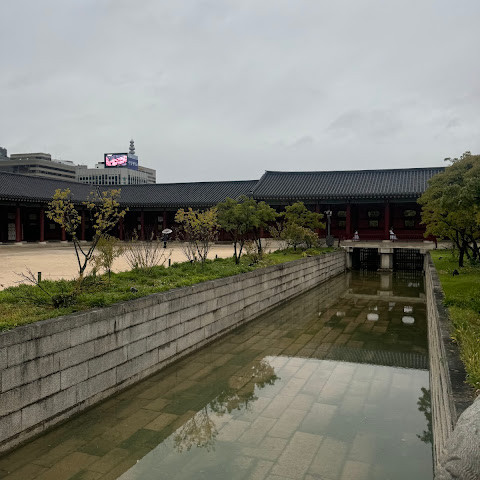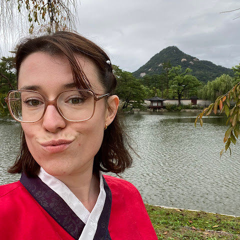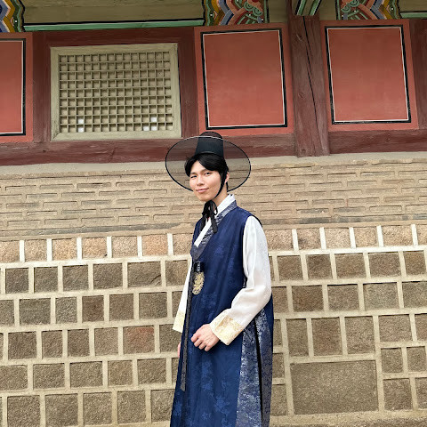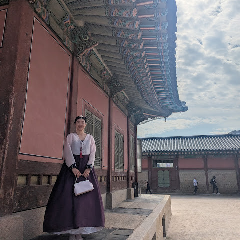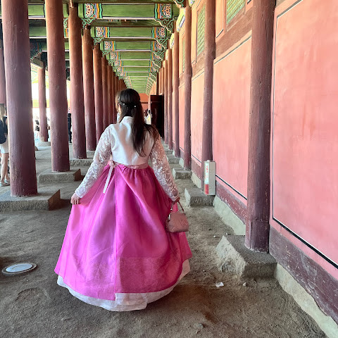 아주 예쁜 전통 한복을 받았는데, 저한테는 좀 짧았던 것 같아요. 가게가 궁궐 근처에 있는데, 오전 9시에 갔을 때랑 오후 1시쯤 돌아왔을 때 엄청 붐벼서 준비하는 데 시간이 좀 걸렸어요.
