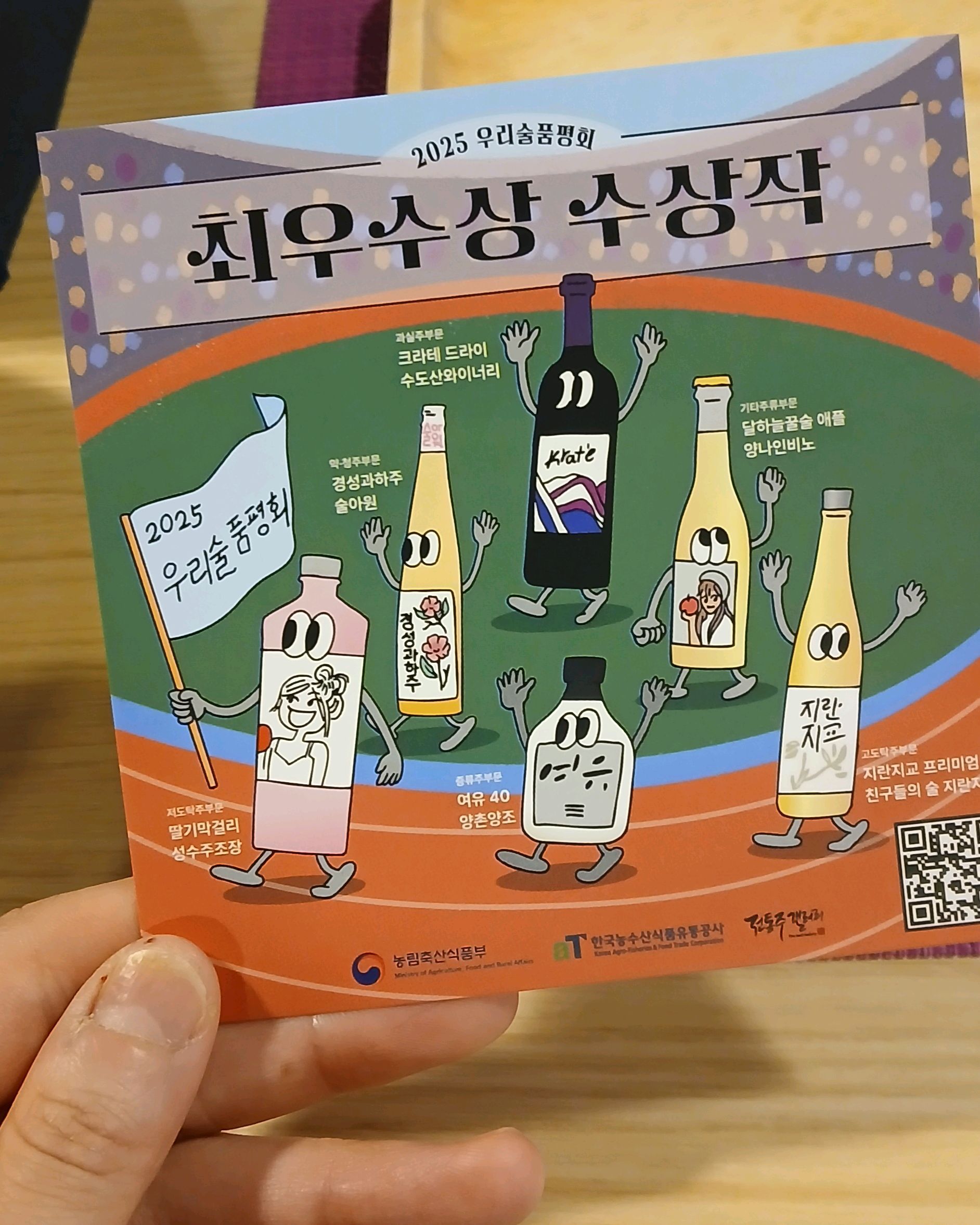 전통주갤러리에서 2025년 우리술 품평회 최우수상작을 맛보았습니다. 리스트는 딸기막걸리, 지란지교 프리미엄 탁주, 경성과하주, 크라테 드라이, 여유, 달하늘꿀술 애플입니다. 저는 여유가 가장 마음에 들었습니다. 증류주 특유의 알콜향이 있으면서 곡류의 달콤함과 발효의 산미가 입안에서 휘몰아치는데 너무나도 근사했습니다. 곁들임 음식 없이 술 자체로 즐길 수 있는 멋진 술인 것 같습니다. 따로 주문해서 맛보려합니다. 물론 다른 술들도 뛰어났습니다. 소중한 기회 고맙습니다.