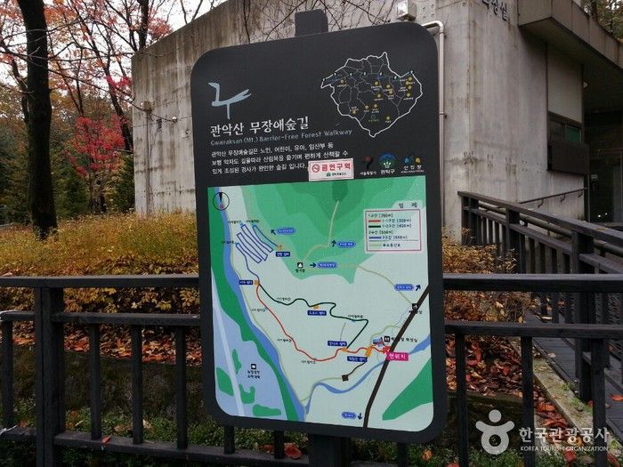 서울대학교 버스정류장에서 관악산 등산로 입구를 통하여 제2광장 화장실 부근에 도착하면 관악산 자락길(무장애숲길) 구간이 시작된다. 2013년 5월 관악산에 처음으로 조성된 무장애 숲길은 전 구간 경사도 8% 미만(장애인 시설 설치 기준)으로 휠체어 및 유모차도 편하게 오를 수 있게 조성하였다. 지형에 따라 산책하듯 숲을 즐길 수 있도록 조성된 순환형 숲길(750m)과 지그재그형 오르막길을 따라 산을 오르며 전망할 수 있는 등반형 숲길(550m)을 구분하였으며, 등반형 숲길을 따라 관악산 열녀암까지 오를 수 있다.