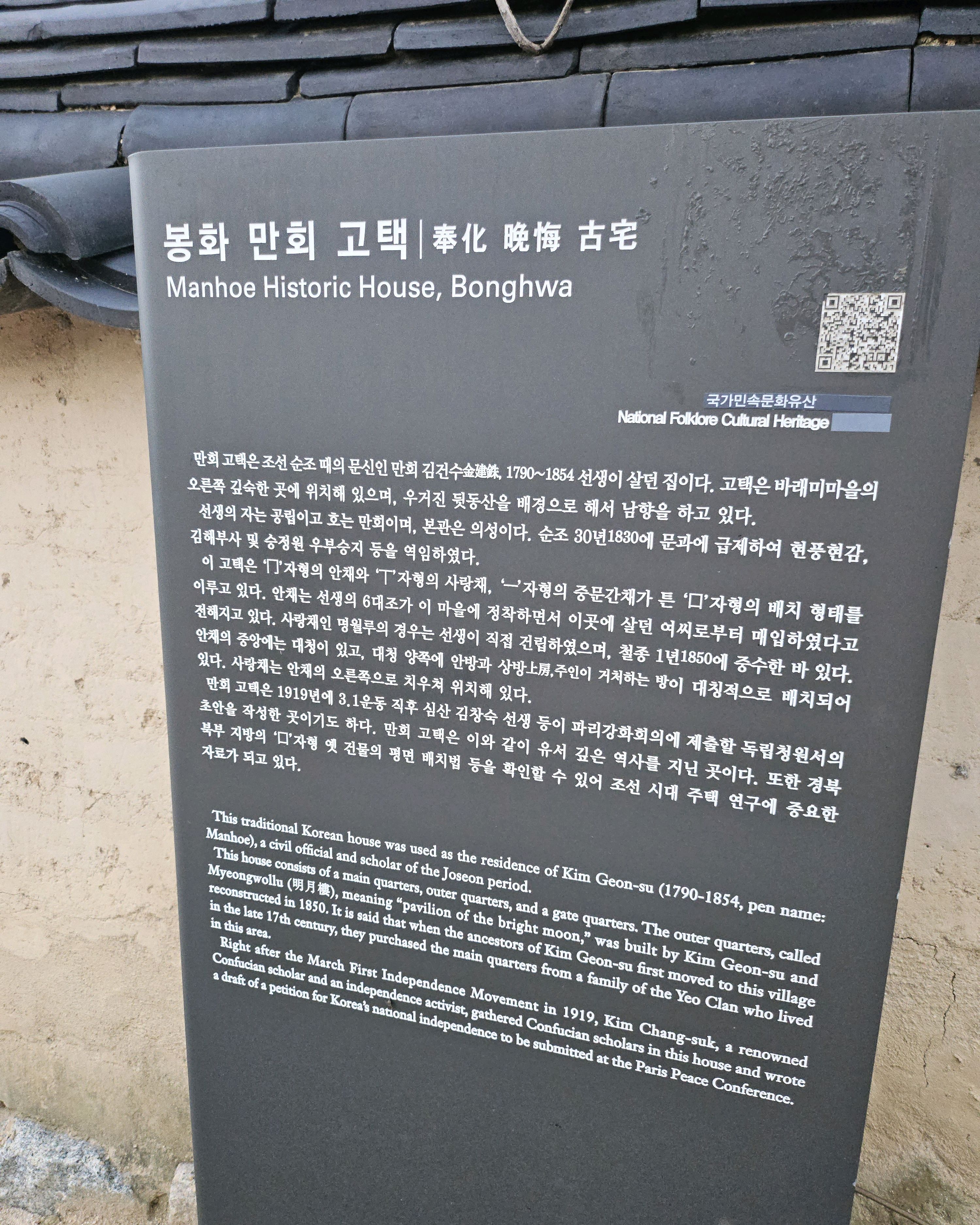 처음 봉화에 방문했어요! 숙소를 검색해보다가 국가인증고택이자 독립유공자분들이 계셨던 만회고택으로 선택!