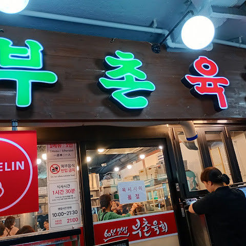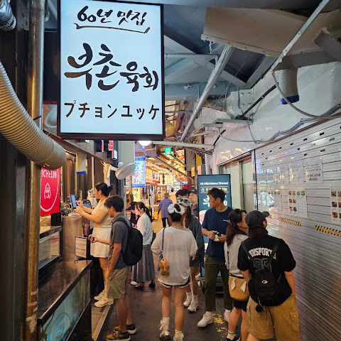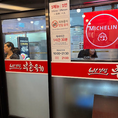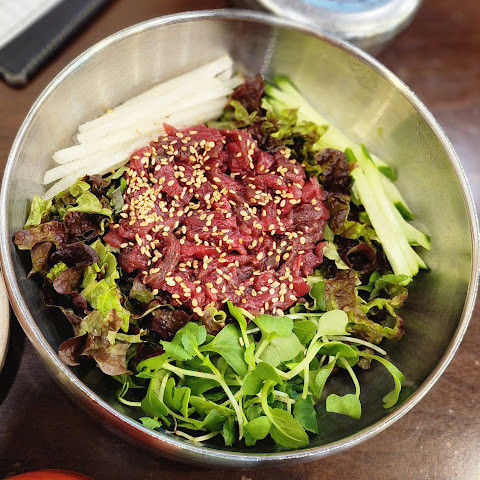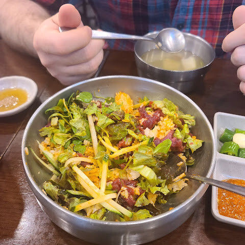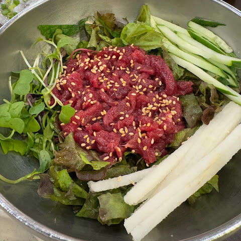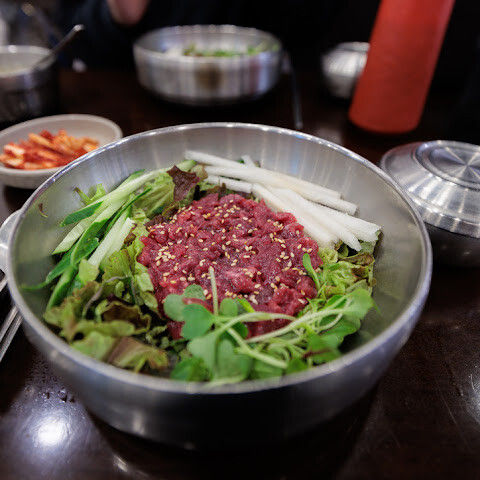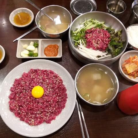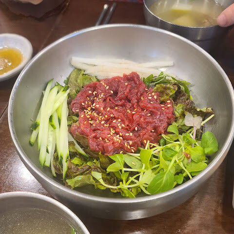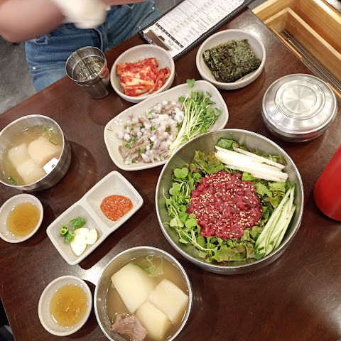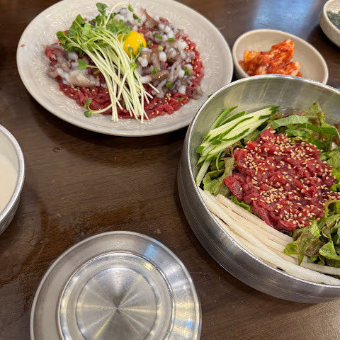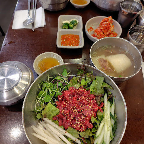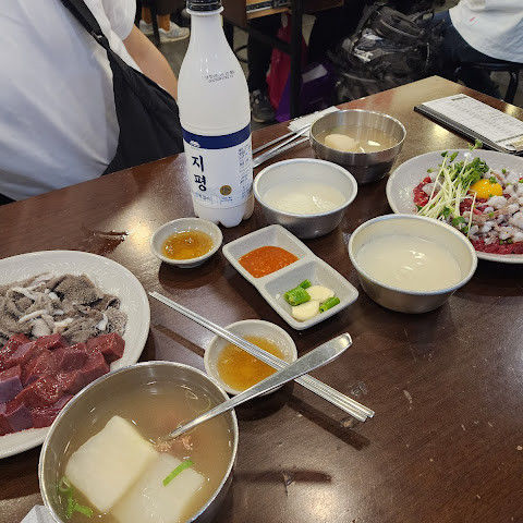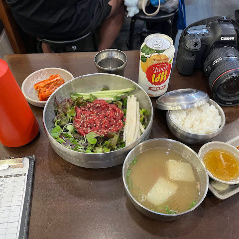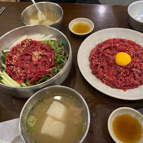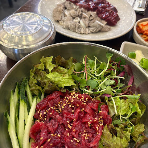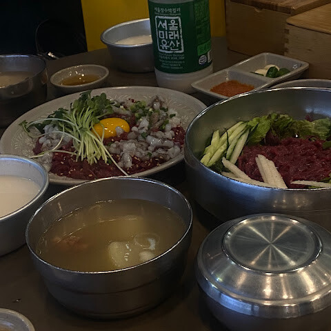 광장시장에 유명한 육회집. 육회집이 많은데 유독 유명하다. 미슐랭에 매년 선정되어서 그런 모양. 바쁜 매장 답게 다양한 국적의 손님들이 오고, 예약시스템을 이용해야한다. 점심 시간 좀 지난 이후에 방문했음에도, 15분 이상 대기하였다. 고기는 정말 신선하고 고소한 육회비빔밥이 일품이었다. 함께 나오는 소고기 무국도 깔끔하고 맛있는 편. 주차는 어렵다.