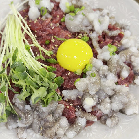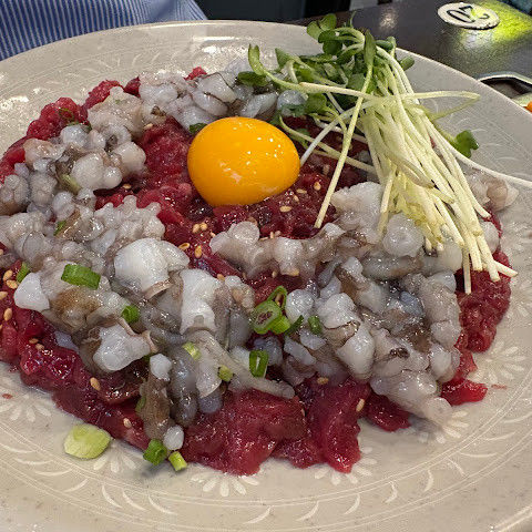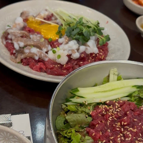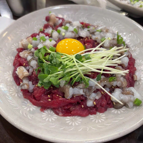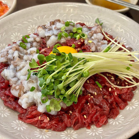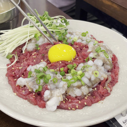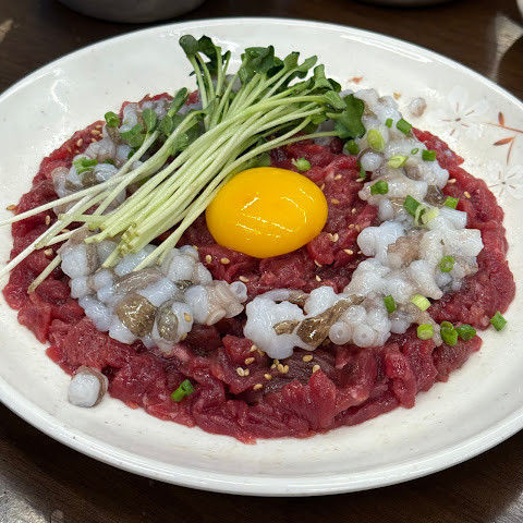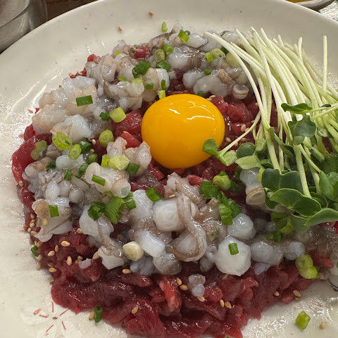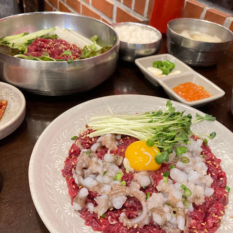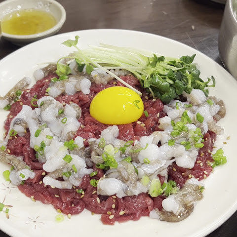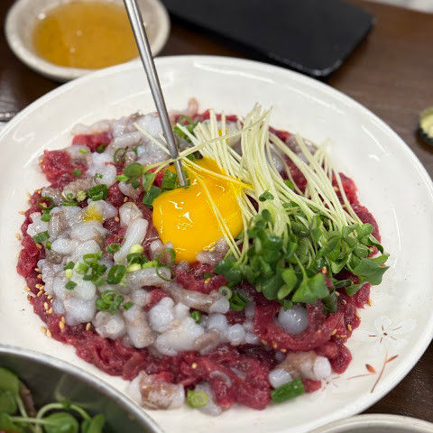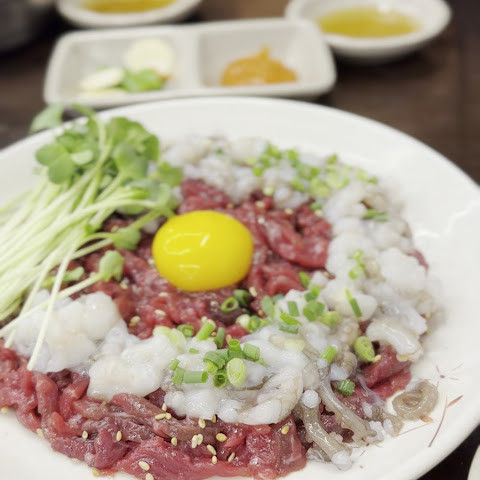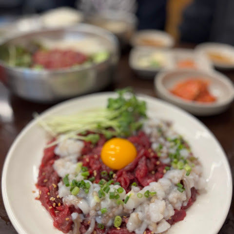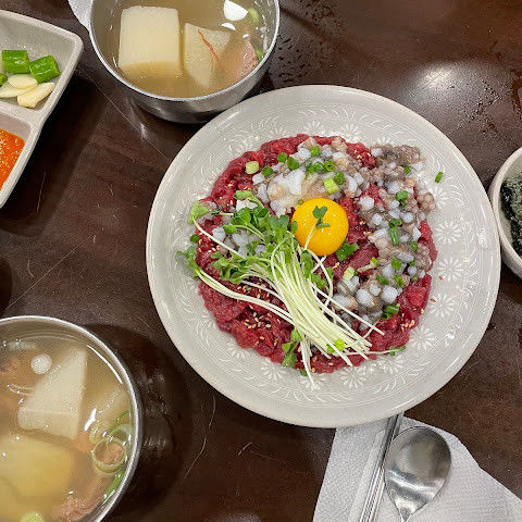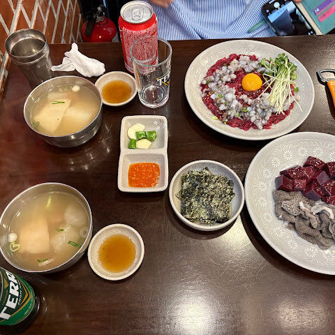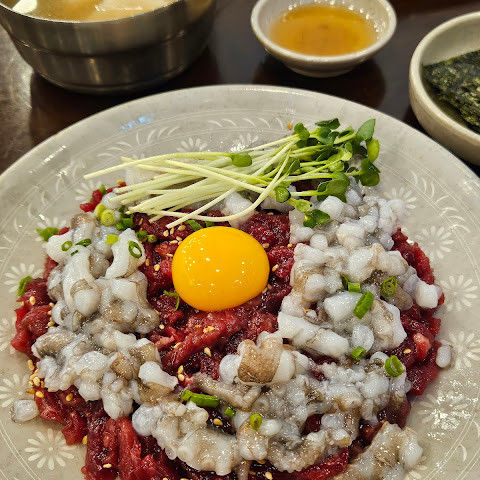미슐랭 가이드에 몇 년 연속 선정된 토무라 생소고기라는 유명한 식당을 기대하고 있습니다. 오전 11시쯤 식당 문 앞에 도착했는데, 안은 이미 만석이었지만 다행히 제 앞에는 세 팀밖에 없었습니다. 오래 기다리지 않고 바로 자리에 앉을 수 있었습니다. 웨이터는 매우 친절했고, 김과 김치를 곁들인 뜨거운 당근 소고기 수프를 바로 내어주었습니다. 참기름에 찍어 먹는 소스는 향이 정말 좋았습니다. 저는 생낙지 계란 노른자 생소고기와 생소고기 비빔밥을 주문했습니다. 생낙지를 처음 먹어봤는데, 살이 쩍쩍 벌어졌습니다. 목에 걸릴까 봐 걱정되어 먹지 못했습니다. 계란 노른자를 먼저 골고루 섞은 후, 바로 참기름과 김에 찍어서 크게 한 입 베어 물었습니다. 비린내도 전혀 나지 않았고, 아주 신선하고 쫄깃한 식감이 특별했습니다. 생소고기 비빔밥도 맛있었고, 꼭 한번 드셔보시기 바랍니다. 정말 좋아요. 다음에도 꼭 다시 올게요. 정말 좋은 경험이었어요~