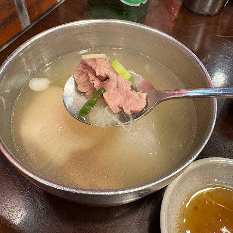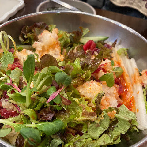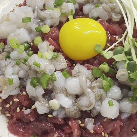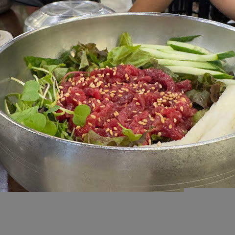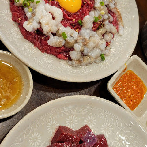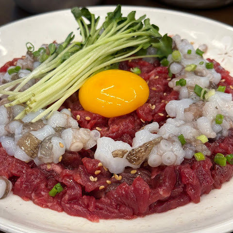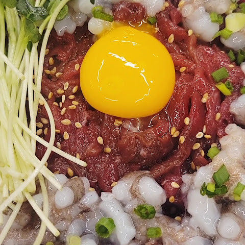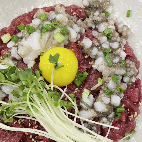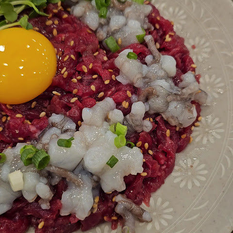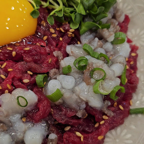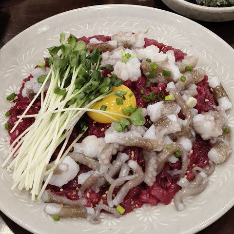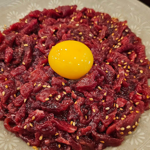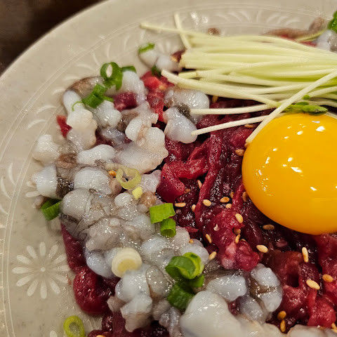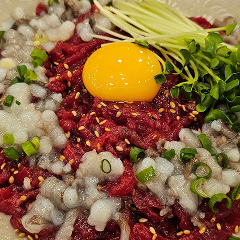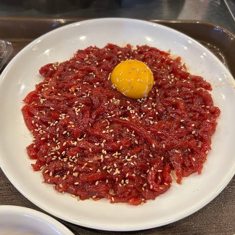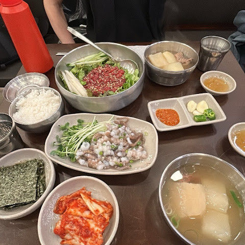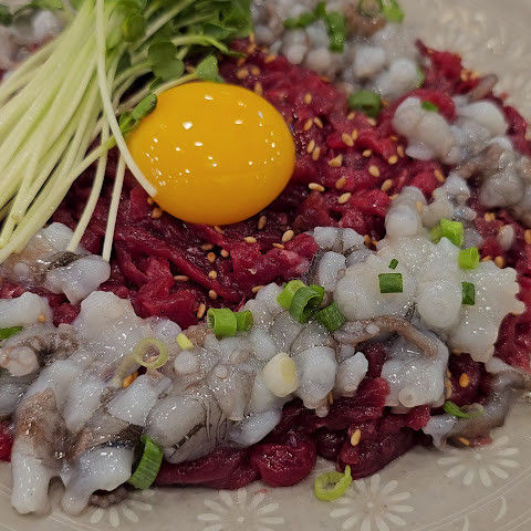 미슐랭 가이드에 몇 년 연속 선정된 토무라 생소고기라는 유명한 식당을 기대하고 있습니다. 오전 11시쯤 식당 문 앞에 도착했는데, 안은 이미 만석이었지만 다행히 제 앞에는 세 팀밖에 없었습니다. 오래 기다리지 않고 바로 자리에 앉을 수 있었습니다. 웨이터는 매우 친절했고, 김과 김치를 곁들인 뜨거운 당근 소고기 수프를 바로 내어주었습니다. 참기름에 찍어 먹는 소스는 향이 정말 좋았습니다. 저는 생낙지 계란 노른자 생소고기와 생소고기 비빔밥을 주문했습니다. 생낙지를 처음 먹어봤는데, 살이 쩍쩍 벌어졌습니다. 목에 걸릴까 봐 걱정되어 먹지 못했습니다. 계란 노른자를 먼저 골고루 섞은 후, 바로 참기름과 김에 찍어서 크게 한 입 베어 물었습니다. 비린내도 전혀 나지 않았고, 아주 신선하고 쫄깃한 식감이 특별했습니다. 생소고기 비빔밥도 맛있었고, 꼭 한번 드셔보시기 바랍니다. 정말 좋아요. 다음에도 꼭 다시 올게요. 정말 좋은 경험이었어요~