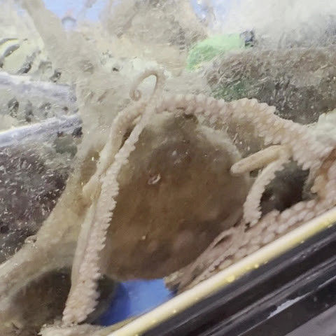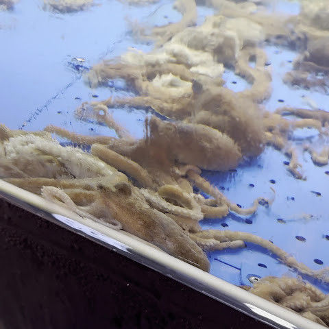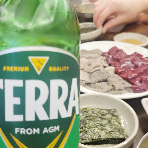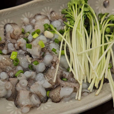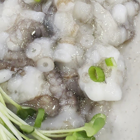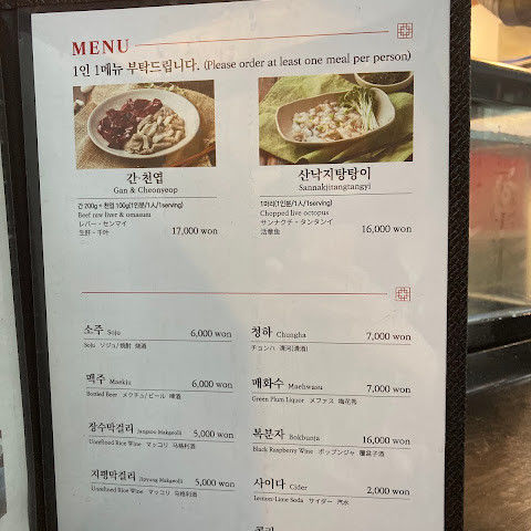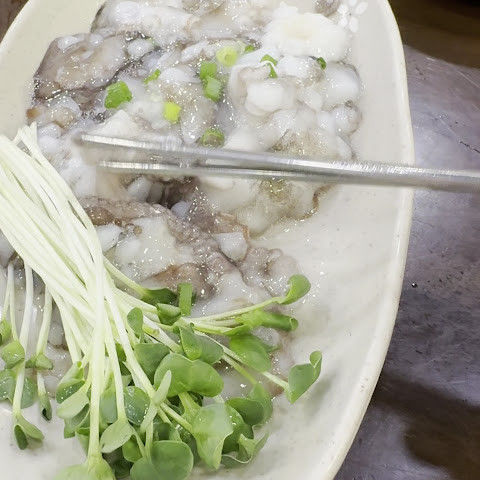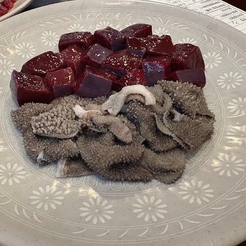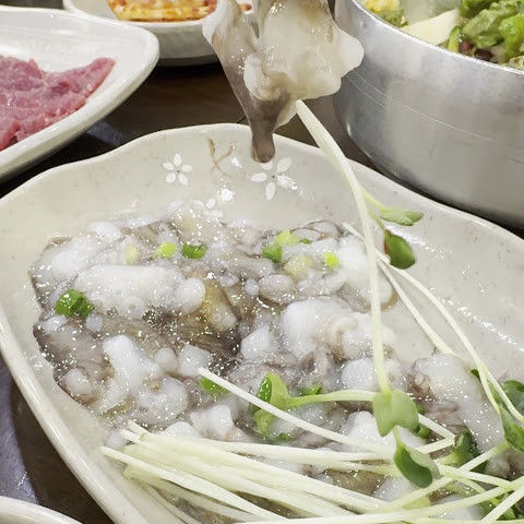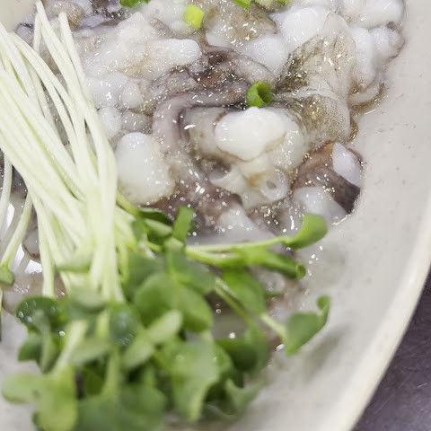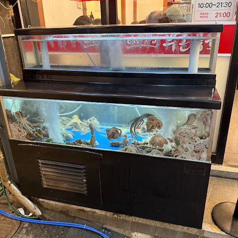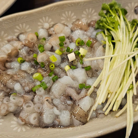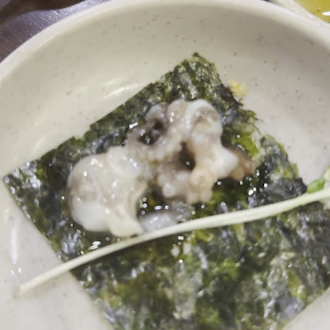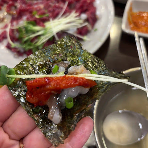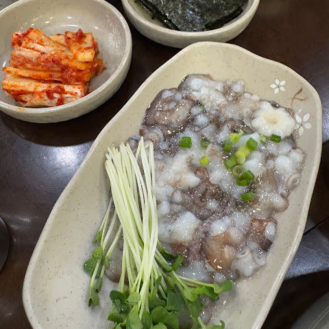 식사는 각자 한 접시씩 주문합니다. 자리에 앉으면 따끈따끈한 소고기 순무 육수가 나옵니다. 육수가 속을 따뜻하게 데워줍니다. 살아있는 문어가 나오는데, 꿈틀거리는 몸통이 조금 무섭습니다. 작은 살아있는 문어를 함께 담은 김을 함께 곁들여 함께 제공되는 소스와 숙주에 찍어서 말아 입에 넣으면 맛있고 신선합니다. 다만 문어가 입에 달라붙는 건 좀 특이합니다.