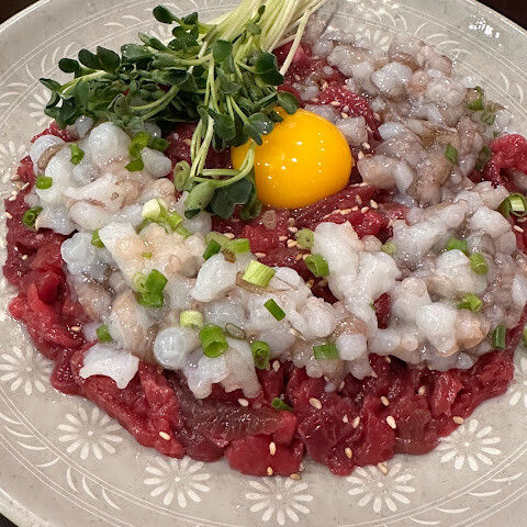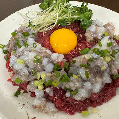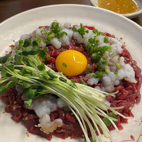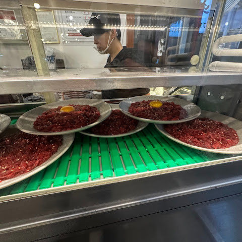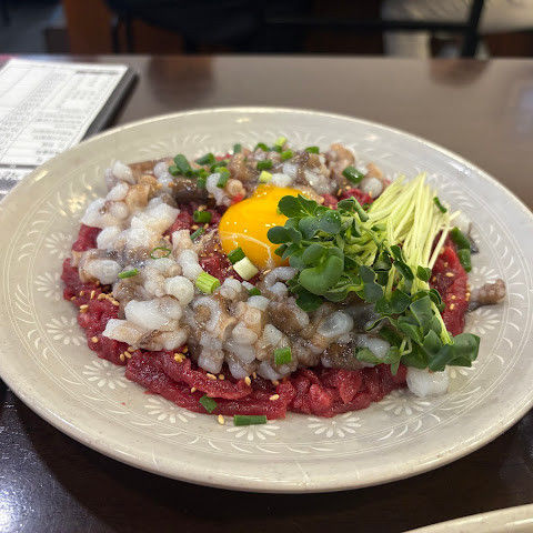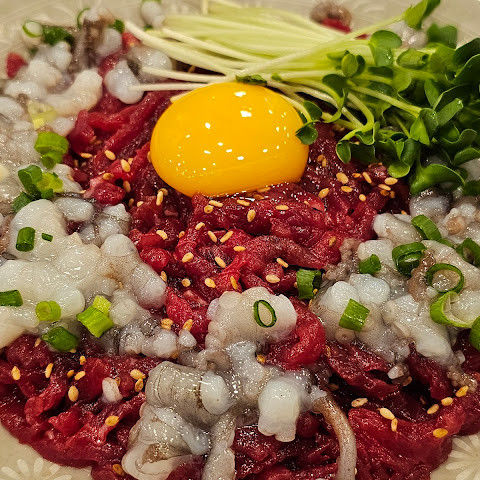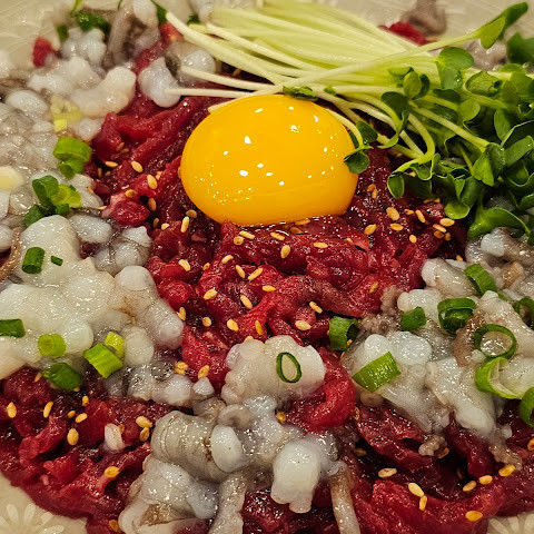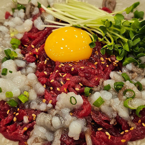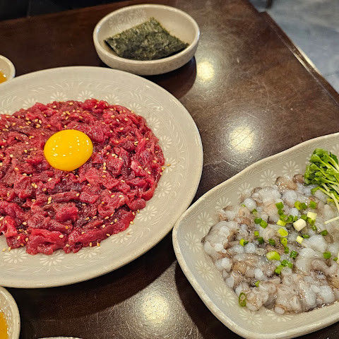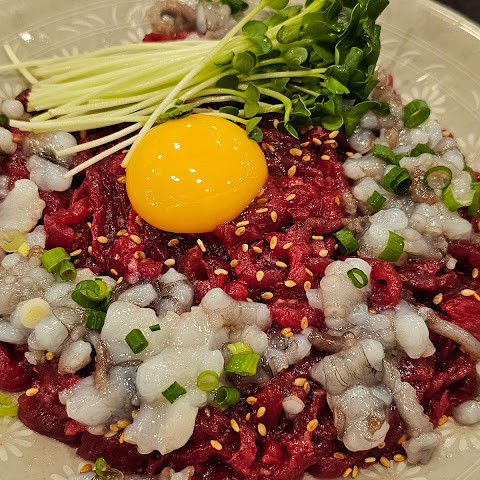 몇 년 연속 미슐랭 스타를 받은 토무라 생소고기라는 유명한 식당을 먹어보고 싶어서 기대가 큽니다. 오전 11시쯤 식당 문 앞에 도착했는데, 안은 이미 만석이었지만 다행히 제 앞에는 세 팀밖에 없어서 오래 기다리지 않고 바로 자리에 앉을 수 있었습니다. 웨이터는 매우 친절했고, 김과 김치를 넣은 따뜻한 당근 소고기 수프를 바로 내어주었습니다. 참기름에 찍어 먹는 소스는 향긋했습니다. 저는 생낙지 계란 노른자 생소고기와 생소고기 비빔밥을 주문했습니다. 생낙지를 처음 먹어봤는데, 살이 쩍쩍 벌어졌습니다. 목에 걸릴까 봐 걱정되어 먹지 못했습니다. 계란 노른자를 먼저 골고루 섞은 후, 바로 참기름과 김에 찍어서 크게 한 입 베어 물었습니다. 비린내도 전혀 나지 않았고, 아주 신선하고 쫄깃한 식감이 특별했습니다. 생소고기 비빔밥도 맛있었고, 꼭 한번 드셔보시기 바랍니다. 정말 좋아요. 다음에도 꼭 다시 올게요. 정말 좋은 경험이었어요~