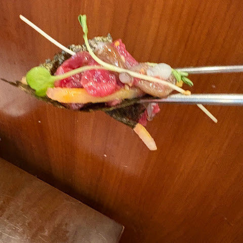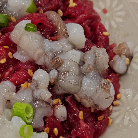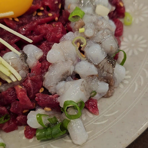식당은 순조롭게 운영됩니다. 차례가 되었을 때 문자가 왔습니다. 살아있는 문어를 곁들인 소고기 타르타르를 주문했는데, 문어가 아직 움직이고 있었습니다. 먹는 방법을 알려주셨는데, 미슐랭 가이드에 있는 곳이라 안심하고 먹을 수 있었습니다. 정말 흥미로운 경험이었습니다. 소고기는 쫄깃쫄깃했고 문어도 맛있었습니다. 가격은 좀 비싼 편이었습니다.