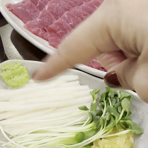 생소고기 위에 배, 숙주나물, 그리고 겨자와 마늘을 살짝 얹어 먹습니다. 비린내도 전혀 없고, 정말 신선해요!