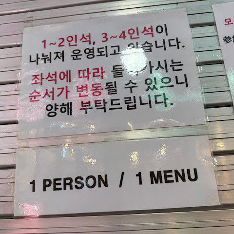 저는 저녁 8시 30분쯤에 갔는데 바로 자리를 잡을 수 있었어요. (아내는 다음 날 저녁 6시쯤 갔는데 본점에는 30팀이 넘고 2호점에는 20팀 정도 줄을 서 있었어요.) 자리에 앉자마자 주문을 하라고 하더라고요. 다행히 저는 가기 전에 메뉴를 보고 가서 뭘 먹을지 미리 알고 있는 편이라 괜찮았어요.