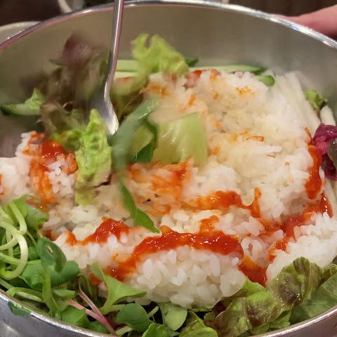 비빔밥은 원래부터 고추장이 타고 있기 때문에 전부 섞어버리면 괴롭고 유케의 맛이 없어진다.