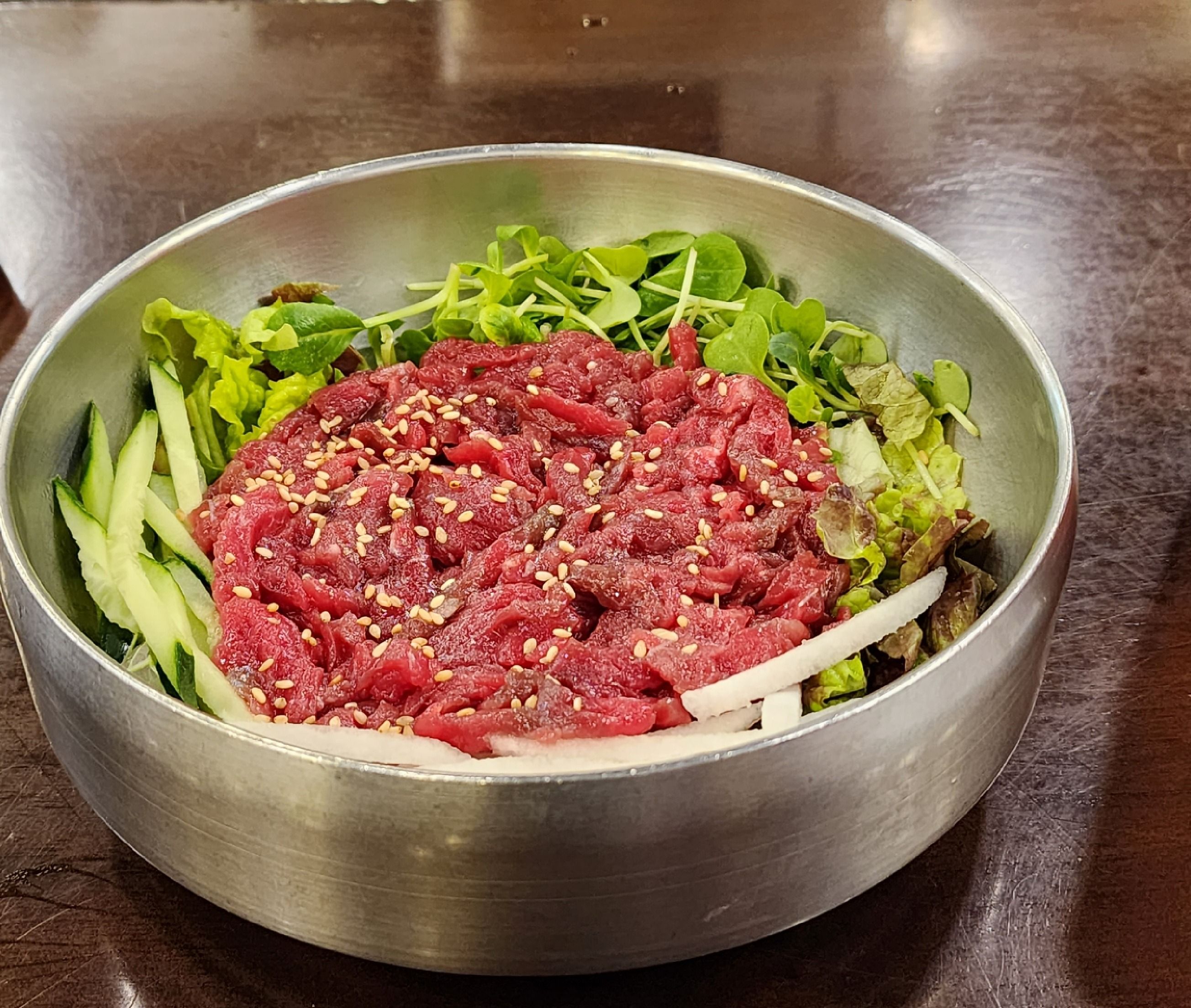 비빔밥 소스를 듬뿍 얹은 생소고기 비빔밥도 정말 맛있어요.