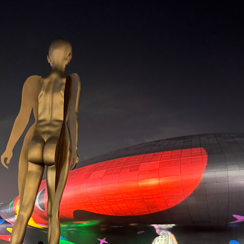 우주선처럼 보이는 호감이 안가는 디자인에, 와닿는 컨텐츠도 많지않아서, 시설만 화려하고, 실속없는 건축물이라 생각했는데, 가끔씩 하는 외관을 이용한 야간 라이트 쇼 축제는, 비호감 외관을 크나큰 장점으로 보이게 하는 듯 합니다.
