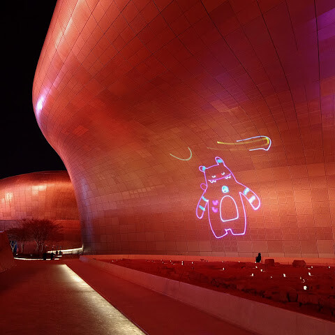우주선처럼 보이는 호감이 안가는 디자인에, 와닿는 컨텐츠도 많지않아서, 시설만 화려하고, 실속없는 건축물이라 생각했는데, 가끔씩 하는 외관을 이용한 야간 라이트 쇼 축제는, 비호감 외관을 크나큰 장점으로 보이게 하는 듯 합니다.