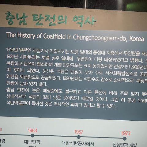 국내 주요 석탄산지인 충남탄전과 이 지역 탄광 근로자들의 공로를 기념하고 현장을 후손들에게 알리기 위하여 개관한 박물관! 전시관은 지하 포함 총 3개의 층으로 되있고 야외 전시관과 어린이 연탄만들기 체험장도 있어요.1층은 주로 석탄 캐기부터 연탄이 되기까지의 과정과 장비들이 전시되있고 2층은 아이들이 좋아하는 석탄 캐기 관련 게임들과 막장체험을 할 수 있어요. 1,2층 관람 후에는 승강기를 타고 마치 지하 300여미터로 내려가는 체험을 하는데 승강기가 계속 깜박이며 지하 1층까지 수십초가 걸렸음ㅋ. 기획전시실을 돌고 114m짜리 냉풍터널(추우니 겉옷 꼭 입고 가세요)을 지나면 외부공간이 나오고 실물들이 전시되 있어요. 나름 신기하고 유익한 시간 보냈어요.