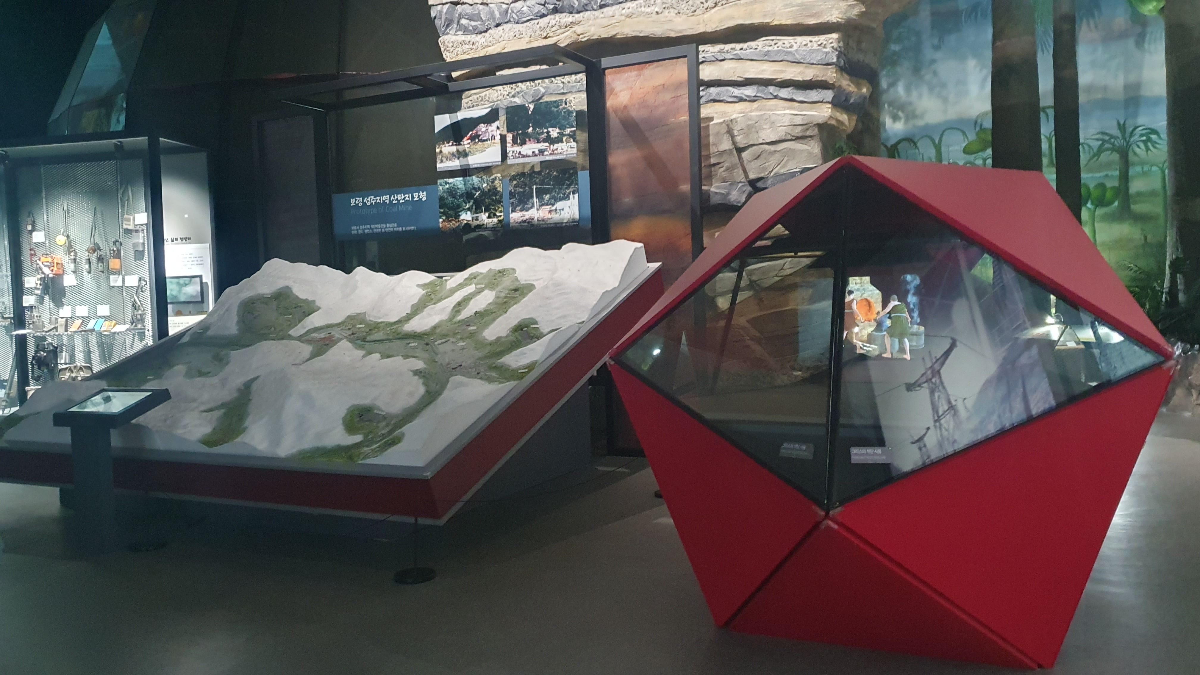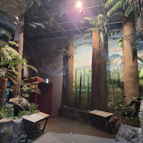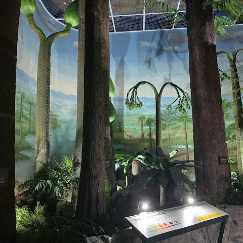 실내전시장 1층 대형식물모형을 시작으로 지층과 암석, 탄전의 역사,탄광장비 등 전시되어있구요->