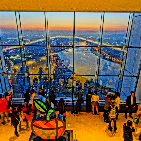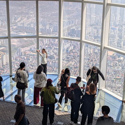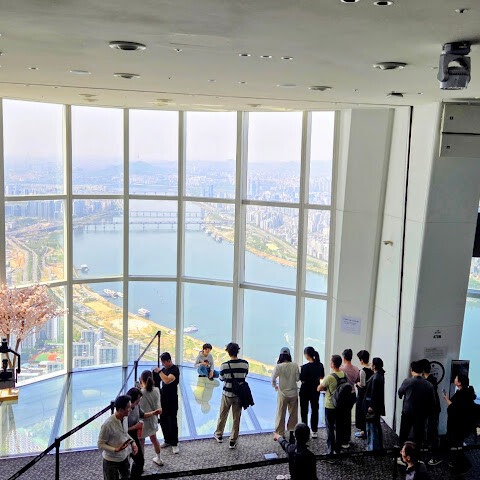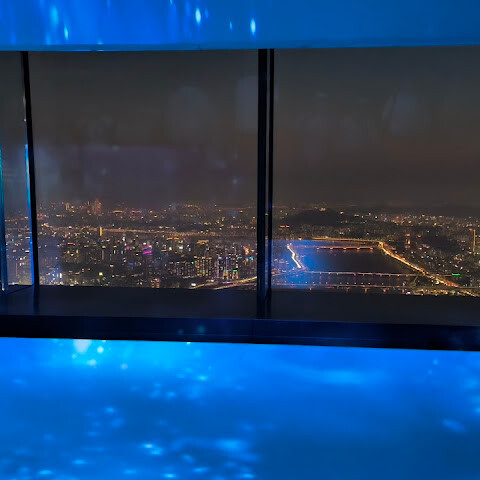 한국에서 꼭 가봐야 할 곳 중 하나지만, 날씨를 잘 골라야 해요. 그래야 아름다운 경치를 감상하거나 꼭대기 층에서 멋진 사진을 찍을 수 있거든요. 안에는 카페도 있고 페이스 페인팅도 할 수 있어요. 저는 현장에서 티켓을 샀는데, 학생 할인도 있더라고요.<br><br>꼭대기 층에서는 서울 시내 전체와 한강을 한눈에 볼 수 있어요. 롯데월드도 바로 아래층에 있고 같은 구역에 있어서 잘 보여요.